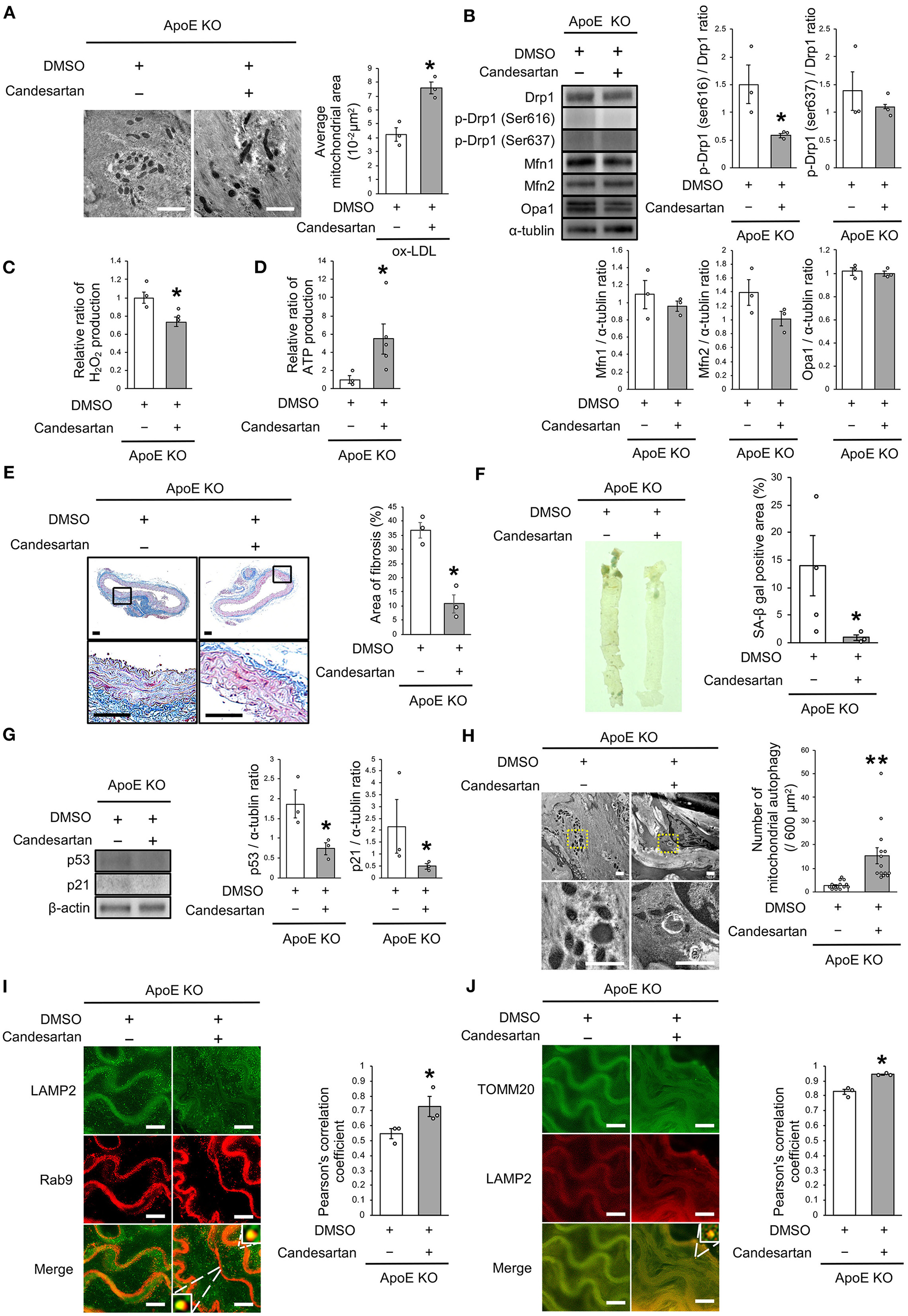 Finally, we investigated whether AT1R inhibition attenuated vascular senescence by regulating mitochondrial dynamics and mitochondrial autophagy in ApoE KO mice. Food intake during the experiment, body weight, heart rate, and blood pressure were not different between ApoE KO mice treated with candesartan or the control vehicle (Table 3). EM revealed that excessive mitochondrial fission was reduced in ApoE KO mice treated with candesartan when compared to that in the control mice (Figure 8A). The arterial expression of Drp1 phosphorylation at serine 616 was lower in ApoE KO mice treated with candesartan when compared to that in the control mice. Other mitochondrial dynamics factors were not significantly different between the two groups (Figure 8B). H2O2 production was lower and ATP production was higher in ApoE KO mice administered candesartan (Figures 8C,D). The ratio of arterial fibrosis and the senescence area were also lower in ApoE KO mice administered with candesartan when compared with the control (Figures 8E,F). Immunoblot analysis showed that the expression of p53 and p21 was lower in ApoE KO mice treated with candesartan (Figure 8G). To examine mitochondrial autophagy induced by AT1R inhibition, we performed EM and immunohistochemistry. The number of autophagy-engulfing mitochondria was higher in ApoE KO mice administered with candesartan when compared to the control (Figure 8H). The colocalization of LAMP2 with Rab9 or TOMM20 was also higher in ApoE KO mice treated with the ARB when compared with the control (Figures 8I,J). Taken together, AT1R inhibition was found to contribute to improved mitochondrial quality control through the suppression of excessive mitochondrial fission and the induction of Rab9-dependent mitochondrial autophagy, causing anti-arterial senescence in ApoE KO mice.