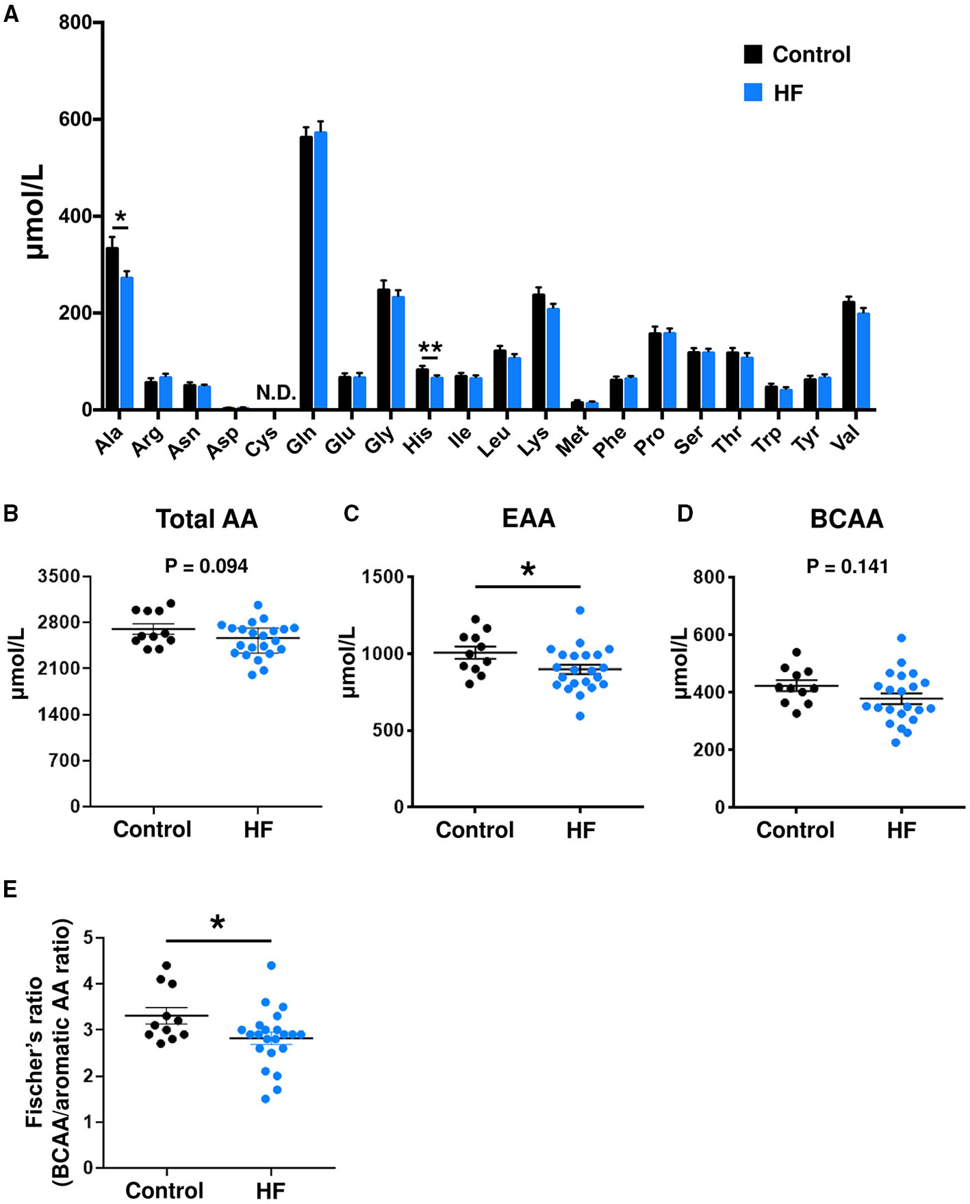 Figure 2. Comparison of plasma amino acid (AA) concentrations between heart failure (HF) patients (n = 22) and control subjects (n = 11). (A) Plasma concentrations of each AA. (B) Plasma concentrations of total AAs. (C) Plasma concentrations of total essential AAs (EAAs), including His, Ile, Leu, Lys, Met, Phe, Thr, Trp, and Val. (D) Plasma concentrations of branched chain AAs (BCAAs), including Leu, Ile, and Val. (E) Fischer's ratio, which is the ratio of BCAAs to aromatic AAs (Phe and Tyr). The data are presented as mean ± SEM. *P < 0.05, **P < 0.01. Ala, alanine; Arg, arginine; Asn, asparagine; Asp, aspartic acid; Cys, cysteine; Gln, glutamine; Glu, glutamic acid; Gly, glycine; His, histidine; Ile, isoleucine; Leu, leucine; Lys, lysine; Met, methionine; Phe, phenylalanine; Pro, proline; Ser, serine; Thr, threonine; Trp, tryptophan; Tyr, tyrosine; Val, valine; N.D., not detected.