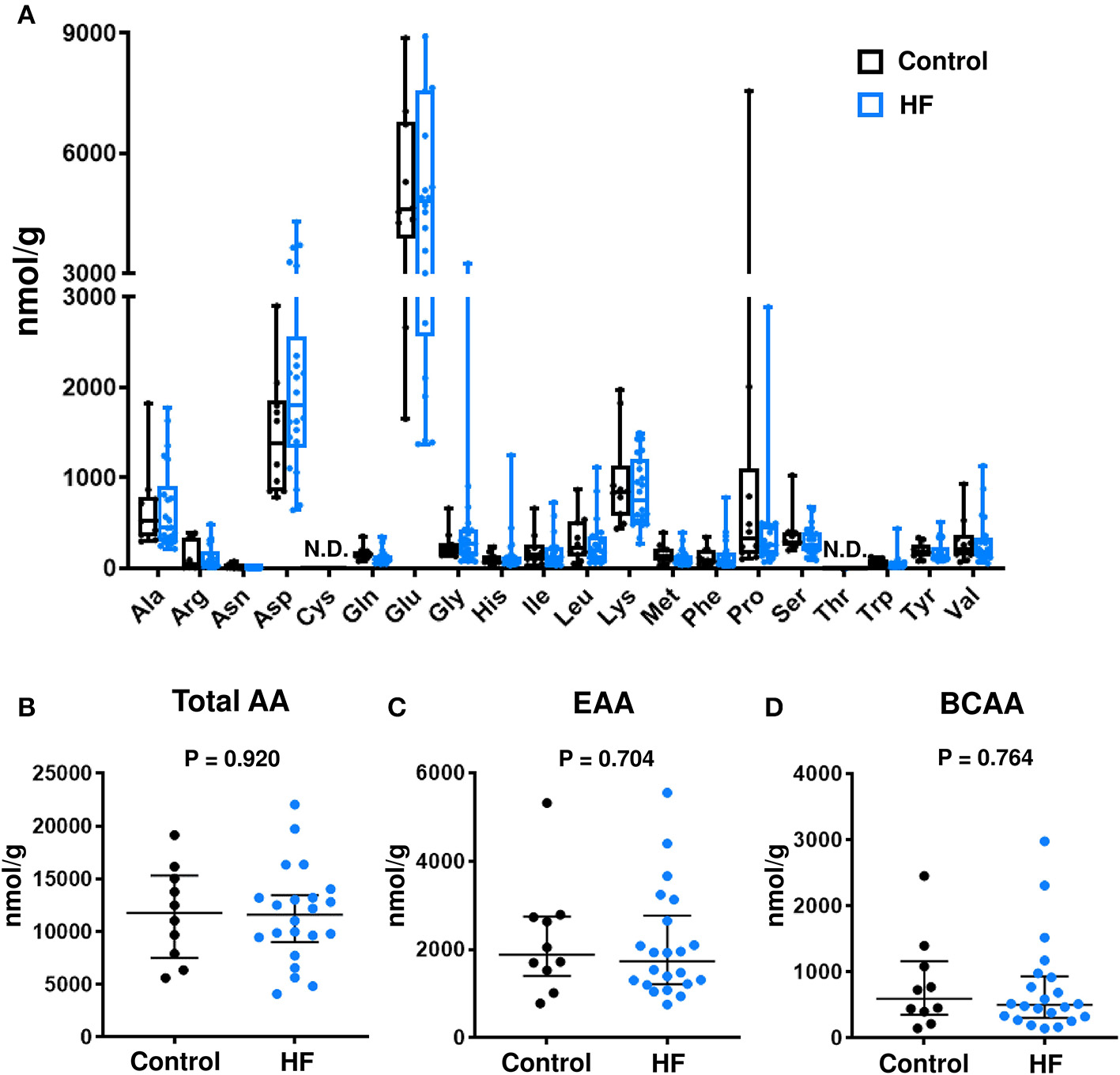 Figure 3. Comparison of fecal amino acid (AA) concentrations between heart failure (HF) patients (n = 22) and control subjects (n = 10). (A) Fecal concentrations of each AA. In the box-and-whisker plot, the middle line represents the median value, the box indicates interquartile range (25–75th percentiles), and the range bars indicate the maximum and minimum values. (B) Fecal concentrations of total AAs. (C) Fecal concentrations of total essential AAs (EAAs), including His, Ile, Leu, Lys, Met, Phe, Thr, Trp, and Val. (D) Fecal concentrations of branched chain AAs (BCAAs), including Leu, Ile, and Val. (B–D) Data are presented as median ± interquartile range (25–75th percentiles). Ala, alanine; Arg, arginine; Asn, asparagine; Asp, aspartic acid; Cys, cysteine; Gln, glutamine; Glu, glutamic acid; Gly, glycine; His, histidine; Ile, isoleucine; Leu, leucine; Lys, lysine; Met, methionine; Phe, phenylalanine; Pro, proline; Ser, serine; Thr, threonine; Trp, tryptophan; Tyr, tyrosine; Val, valine; N.D., not detected.