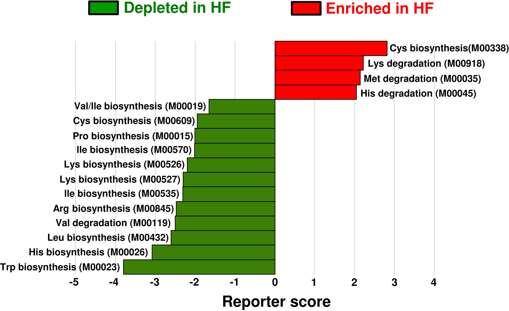 Figure 4. Functional alterations in gut microbial amino acid metabolism among patients with heart failure (HF). Differentially enriched Kyoto Encyclopedia of Genes and Genomes (KEGG) orthology modules in amino acid metabolism between patients with HF (n = 22) and controls (n = 11) are shown. The enriched modules in patients with HF and controls are indicated with positive reporter scores (red) and negative reporter scores (green), respectively. Arg, arginine; Cys, cysteine; His, histidine; Ile, isoleucine; Leu, leucine; Lys, lysine; Met, methionine; Pro, proline; Trp, tryptophan; Val, valine.
