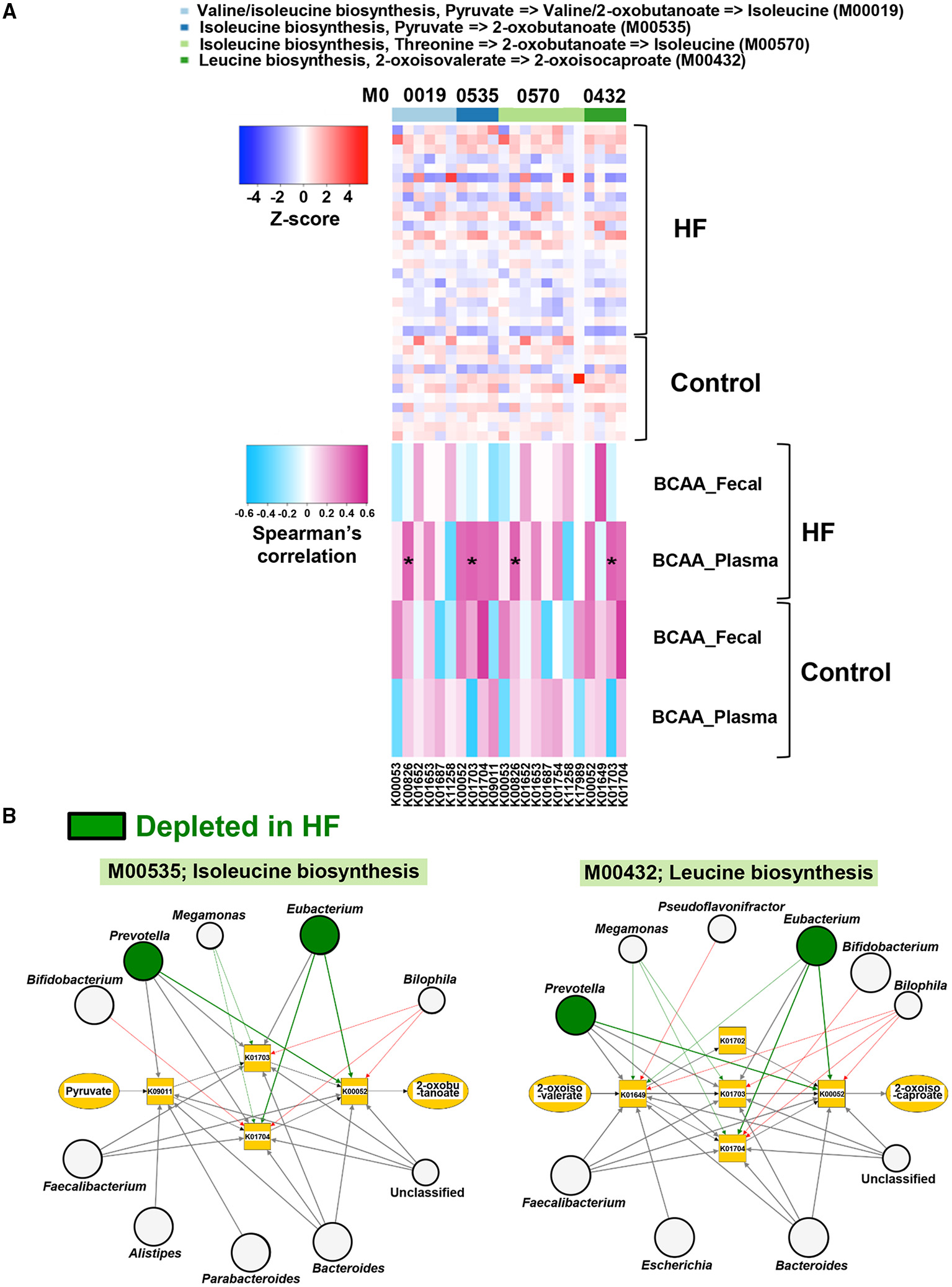 Figure 5. Correlations of gut microbial functions with host plasma and fecal branched chain amino acid (BCAA) concentrations along with the visualization of genera associated with BCAA biosynthesis. (A) Correlations of abundances of genes involved in BCAA biosynthesis with plasma and fecal BCAA concentrations in heart failure (HF) patients (n = 22) and controls (n = 11). (B) Kyoto Encyclopedia of Genes and Genomes (KEGG) orthology (KO) genes and their associated genera in BCAA biosynthesis (M00535 and M00432) are shown. The genera depleted in patients with HF (n = 22) are indicated by green circles. Arrows are drawn from the top 5 abundant genera in each KO gene (thick arrows) or from the genera with differentially enriched KO genes between patients with HF (n = 22) and controls (n = 11). Red arrows indicate that the KO genes possessed by each genus were significantly increased in patients with HF (n = 22). Green arrows indicate the KO genes significantly decreased in patients with HF (n = 22). Large circles indicate the top 10 abundant genera (i.e., Bacteroides, Prevotella, Subdoligranulum, Eubacterium, Escherichia, Streptococcus, Bifidobacterium, Faecalibacterium, Alistipes, and Parabacteroides) in all samples (n = 33). *P < 0.05.