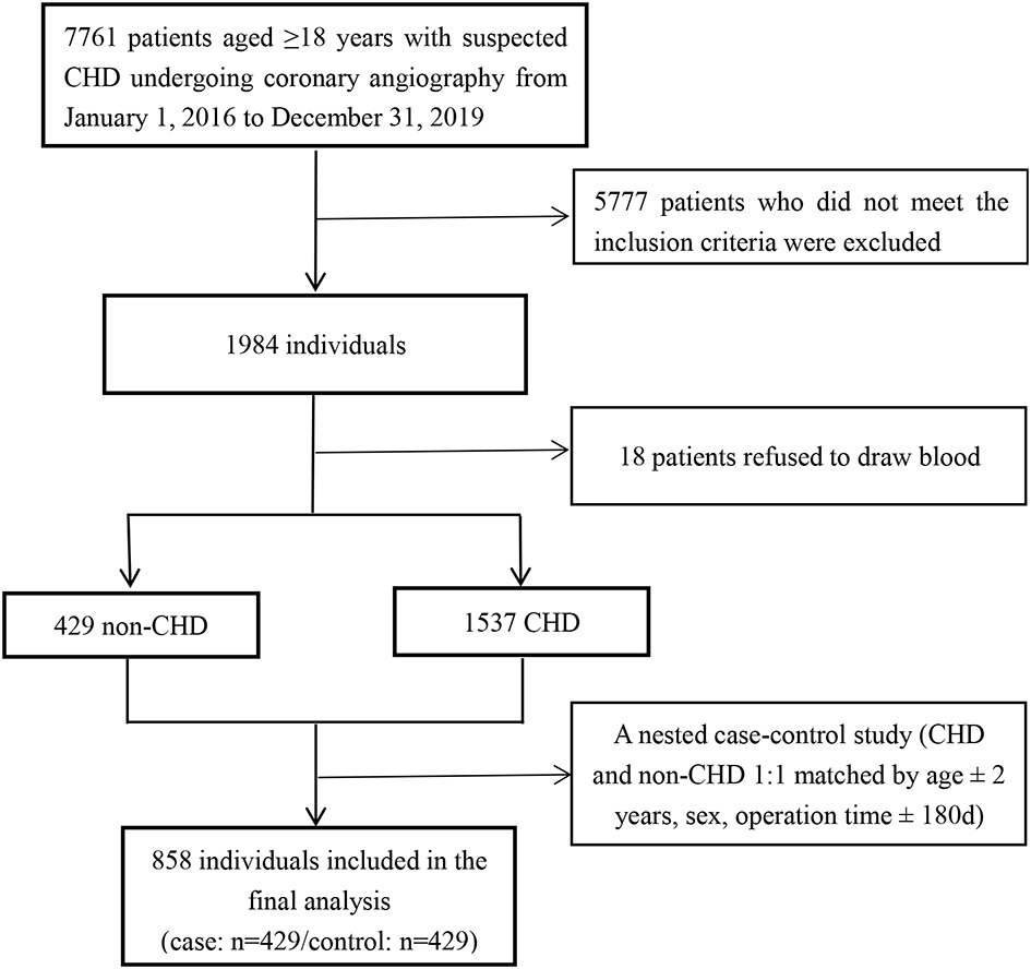 Figure 1 is the flowchart of study participants. From January 1, 2016, to December 31, 2019, 7,761 patients were screened. Of these patients, 1984 were determined to be eligible for the study based on the inclusion and exclusion criteria. Patients without a blood sample for vitamin detection (n = 18) were excluded, leaving a final total of 1,966 eligible participants. A hospital-based, case-control cohort within this population was established. Cases were defined as having at least 70% stenosis of one major coronary artery by coronary angiography. Control subjects were chosen from those who remained free of CHD, determined by cardiac catheterization, and defined as having <30% stenosis of all major coronary arteries. We identified 1,537 incident CHD cases and 429 non-CHD controls. Cases and controls were matched on age (within 2 years), sex, and operation time (within 3 months) on a 1:1 ratio. Thus, the sample for analysis consisted of 429 matched pairs of cases and controls.