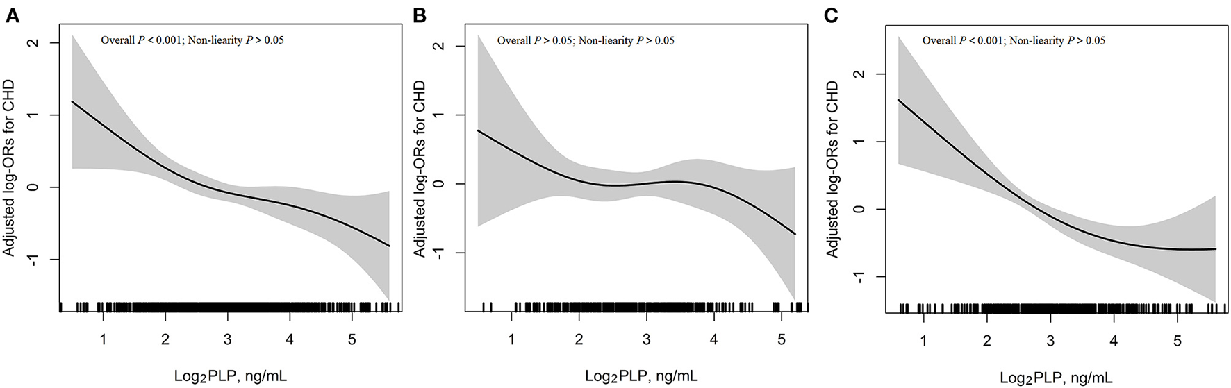 Association between plasma log2PLP and risk of CHD. (A) Overall population; (B) Men; (C) Women. Adjustment factors included sex (only for overall population), age, BMI, smoking status, drinking status, hypertension, diabetes, hyperlipidemia, family history of CHD and hcy.