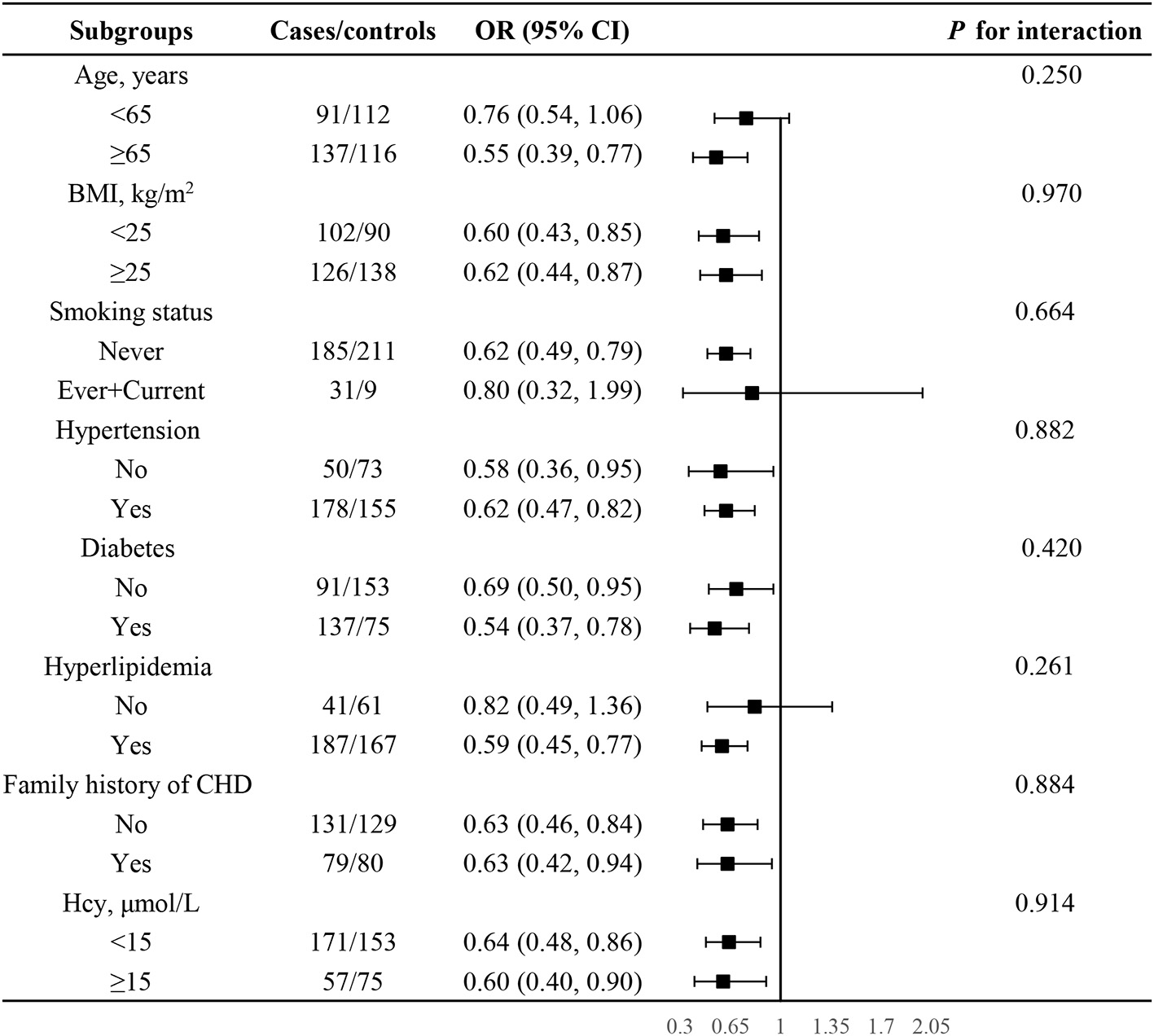 To evaluate the potential effect modification, stratified analyses were further assessed for age (<65, ≥65 years), BMI (<25, ≥25 kg/m2), smoking status (never, ever+current), drinking status (never, ever+current), hypertension (no, yes), diabetes (no, yes), hyperlipidemia (no, yes), family history of CHD (no, yes), and hcy (<15, ≥15 μmol/L). Heterogeneity across subgroups was assessed by fitting simultaneous logistic regressions and are presented in forest plots. Interactions between subgroups and plasma PLP were examined by likelihood ratio testing.