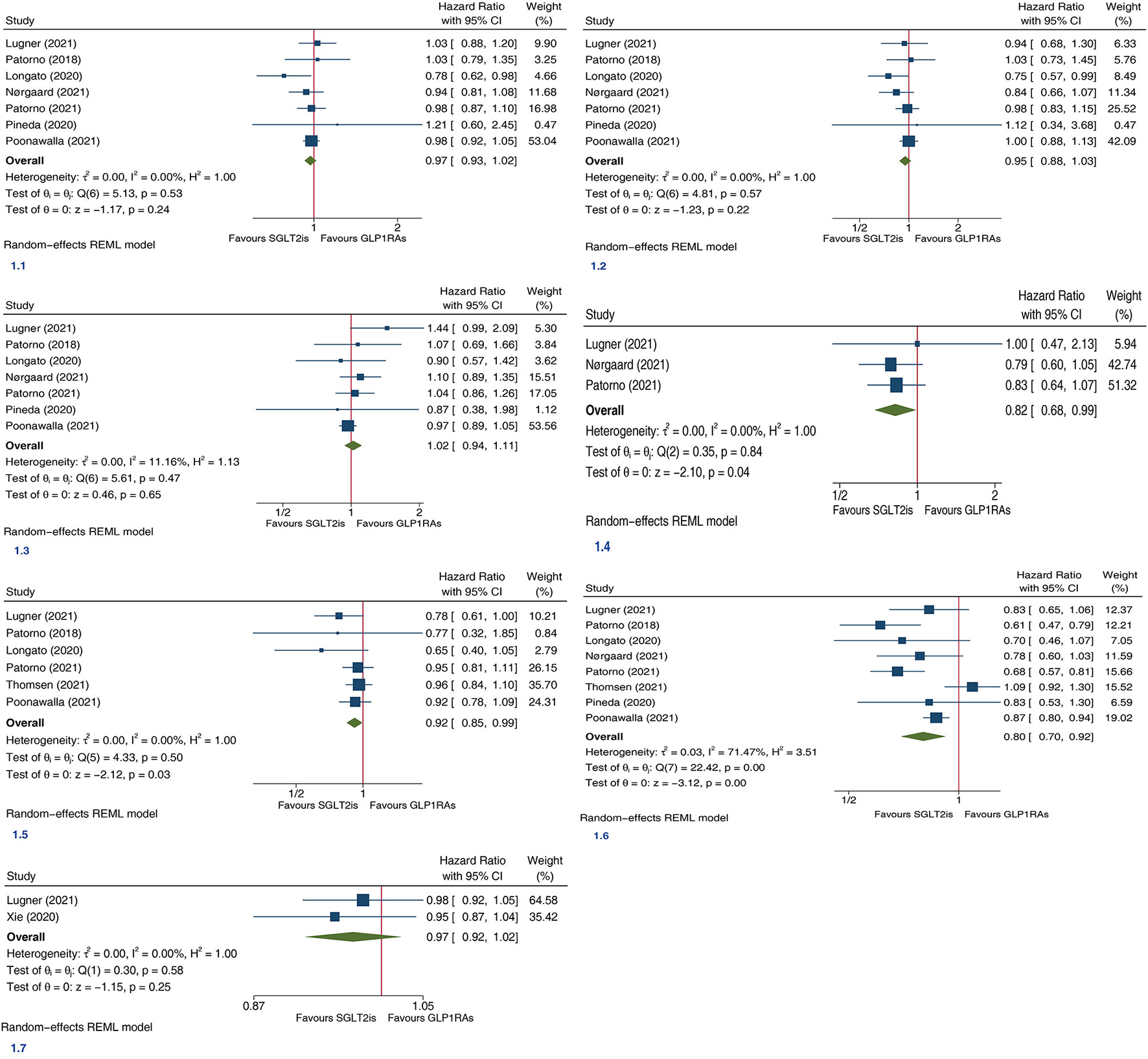 Forest plots of the efficacy of SGLT2is vs. GLP1RAs on seven (1.1, Major adverse cardiovascular events; 1.2, myocardial infarction; 1.3, stroke; 1.4, cardiovascular death; 1.5, all-cause mortality; 1.6, hospitalization for heart failure; 1.7, composite kidney outcome) cardiorenal and death endpoints in patients with type 2 diabetes. SGLT2is, sodium-glucose cotransporter 2 inhibitors; GLP1RAs, glucagon-like peptide-1 receptor agonists; CI, confidence interval; REML, maximum likelihood method.