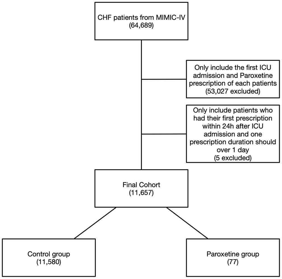 This study was designed to investigate whether paroxetine administration independently contributes to improving the mortality of patients with HF. We used the ICD-9 and ICD-10 codes to identify specific diseases, and the codes were documented by hospital staff on patient discharge. We used only the data from each patient's first ICU admission in this study. The patients who were prescribed paroxetine for longer than 24 h in the initial prescription after their hospital admission were categorized into the paroxetine group, with the remaining HF patients making up the control group. The code for data extraction is available on GitHub (https://github.com/MIT-LCP/mimic-code).