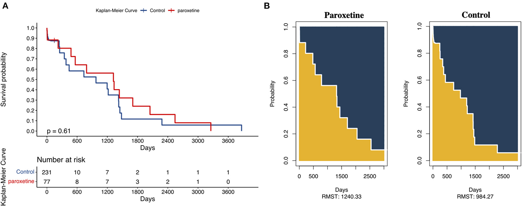 Kaplan–Meier (KM) estimation, logistic regression, and Cox regression were performed to detect the association between paroxetine therapy and outcomes. Restricted mean survival time (RMST) analysis was performed to describe the area under the KM survival curve during a pre-specified timepoint.