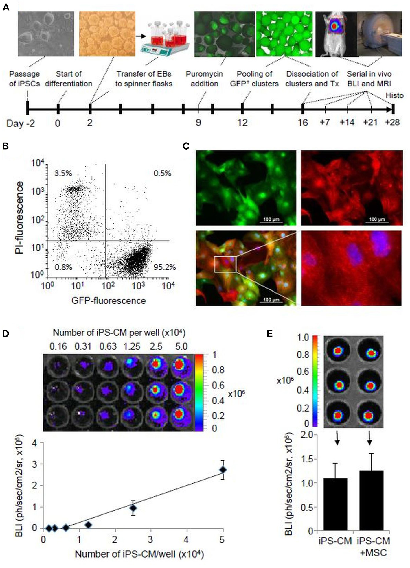 Cardiomyocytes were generated from transgenic murine iPSC line pUbC-FLuc-αPIG (clone C3) that expresses luciferase under the control of a constitutive ubiquitin C promoter (pUbC) and puromycin resistance and enhanced green fluorescent protein (eGFP) genes under the control of a cardio-specific α-myosin-heavy-chain promoter. The generation, characterization, and cardiac differentiation of this cell line have been described elsewhere (35). The differentiation of iPSC is induced by embryoid body (EB) formation as illustrated in Figure 1A using Iscove's Modified Dulbecco's Medium (IMDM) supplemented with 20% fetal bovine serum (FBS), 1 × non-essential amino acids, 0.1 mM β-mercaptoethanol (all from Life Technologies, Carlsbad, CA, USA), and 50 μg/ml ascorbic acid (Wako Chemicals USA Inc., Richmond, VA, USA) in non-adherent cell culture dishes on a shaker. After 2 days, 3 × 104 EB were transferred to spinner flasks (Integra, Hudson, NH, USA) containing 200 ml of differentiation medium. On day 9 of differentiation, 8 μg/ml puromycin (Invivogen, San Diego, CA, USA) was added to the media for CM selection. On day 12, the CM clusters were transferred to a 10 cm cell culture dish and cultured on a shaker until day 16 when they were dissociated with 0.25 g/l trypsin and 0.2 g/l ethylenediaminetetraacetic acid (EDTA, both Life Technologies) containing 5 U/ml DNAse (Sigma-Aldrich, St. Louis, MO, USA) and used for transplantation experiments.