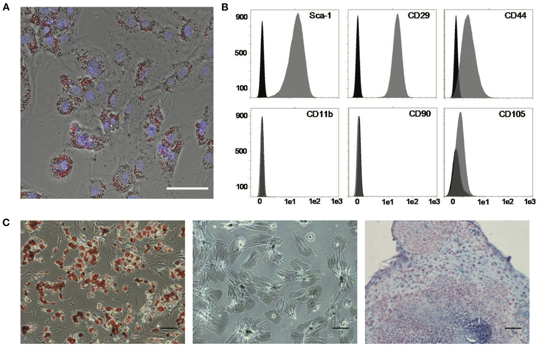 After 6–8 weeks in culture and expansion for additional 3–4 passages, MSC freshly isolated from the bone marrow of C57BL/6 mice exhibited a morphologically homogeneous, proliferative population of spindle-shaped cells. Overnight incubation of MSC with microspheres resulted in almost complete labeling of the MSC population (Figure 2A) without interfering with MSC defining features, as reported previously (36). The analysis of cell-type defining surface markers confirmed the expression of CD29 (99.95 ± 0.02%), CD44 (74.91 ± 24.11%), and Sca-1 (90.88 ± 13.60%), whereas CD11b, CD90, and CD105 were not expressed (Figure 2B). Cultivation of MSCs in selective media confirmed that they possess adipogenic, osteogenic, and chondrogenic differentiation potential (Figure 2C).