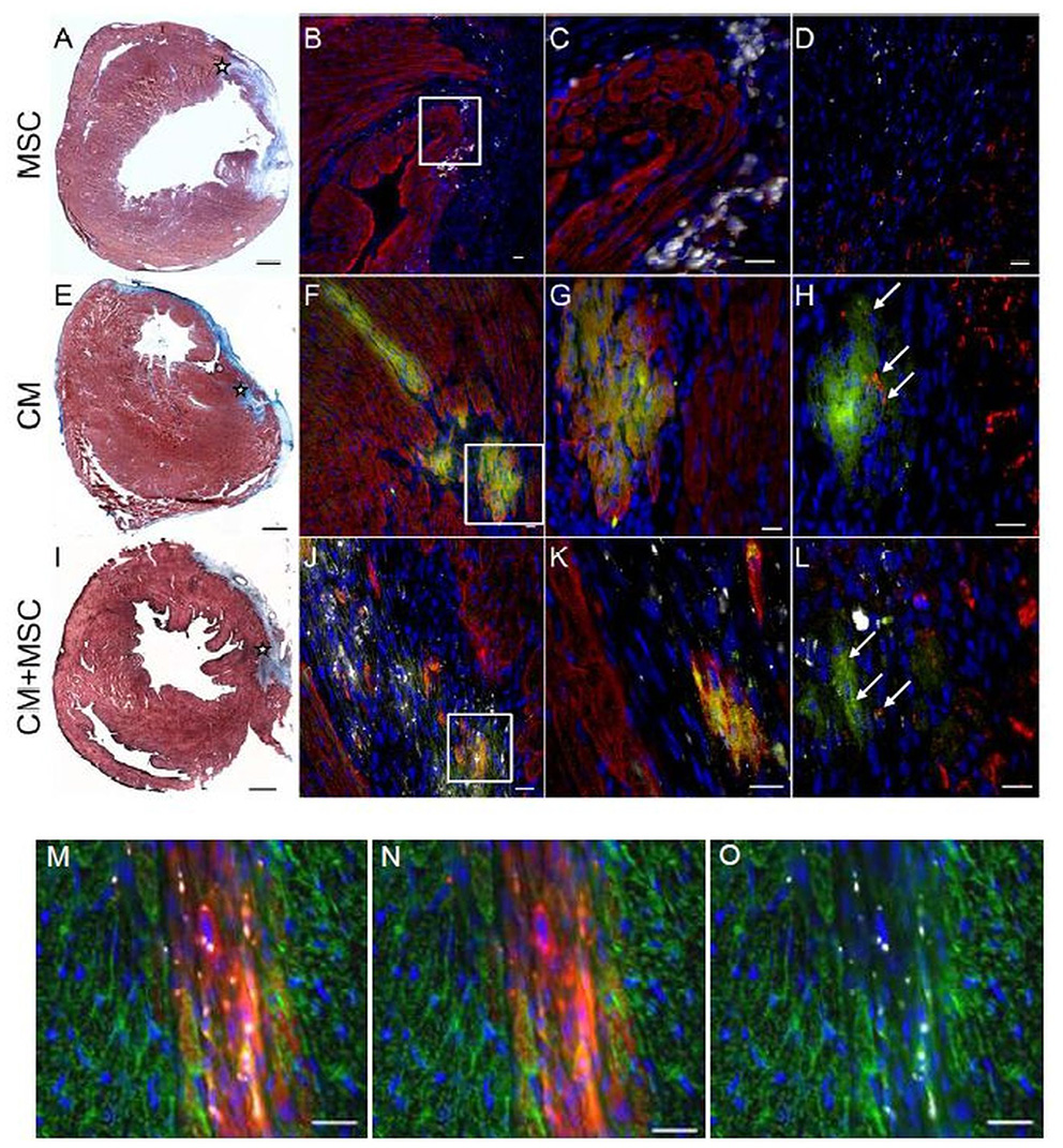 Immunohistochemical detection of transplanted cells in host myocardium. Representative photomicrographs from three experimental groups 4 weeks after intramyocardial injections of either MSC (A–D), iPS-CM (E–H), or iPS-CM+MSC (I–L). (A,E,I)Masson's Trichrome stainings of transverse sections of hearts 4 weeks after operations with fibrotic scar tissue stained blue. The injection site in the peri-infarct region is marked with an asterisk. Scale bars: 500 μm. (B,F,J) Immunohistological stainings of sections containing transplanted cells 4 weeks after operations. eGFP (green), α-actinin (red), microspheres (white), nuclei (blue). Scale bars: 20 μm. (C,G,K) Magnified view of areas in white boxes in images at left. Scale bars: 20 μm. (D,H,L) Immunohistological stainings of the same area in neighboring sections of sections shown in images at left. eGFP (green), connexin 43 (red), microspheres (white), nuclei (blue). Scale bars: 20 μm. (M,N,O) Immunohistological stainings of sections from the MSC group with grafted MSC showing co-localization of internalized microspheres (white) with membrane stain Vybrant DiI-CM (red). α-actinin (green), nuclei (blue). Scale bars: 20 μm. eGFP, enhanced green fluorescent protein; CM, cardiomyocytes; MSC, mesenchymal stromal cells.