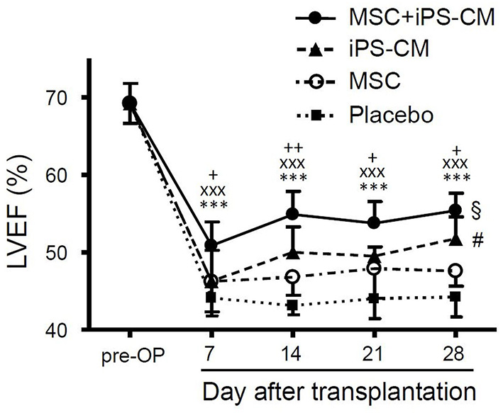 Assessment of cardiac function from weekly cardiac MRI scans after induction of MI. LVEF was determined in healthy animals pre-operatively and at weekly intervals after MI and cell transplantation in groups that received PBS (n = 9), MSC (n = 9), iPS-CM (n = 8), or iPS-CM+MSC (n = 8). Statistically significant results for iPS-CM+MSC group: ***P < 0.001 vs. placebo, xxxP < 0.001 vs. MSC, +/++P < 0.05/0.01 vs. iPS-CM; §P < 0.05: iPS-CM+MSC on day 1 vs. iPS-CM+MSC on day 7; #P < 0.05: for iPS-CM on day 1 vs. iPS-CM on day 7 (all one-way ANOVA with the Tukey-Kramer post-hoc test). CM, cardiomyocytes; MSC, mesenchymal stromal cells; iPS, Induced pluripotent stem cell; LVEF, left ventricular ejection fraction.