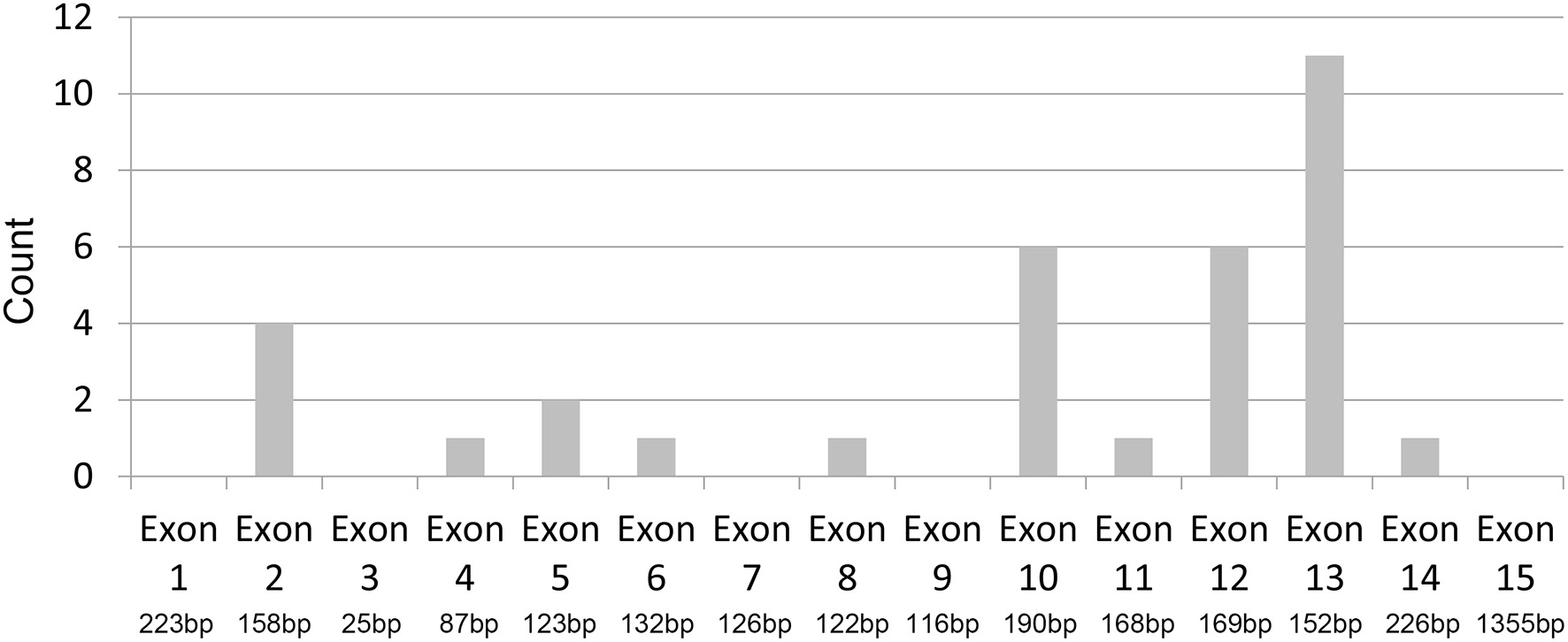 | VTE 15 | 59 | F | 29 | c.1146_1147delAT | p.Trp383Glufs*11 | E10 | LGR1 | rs312262905 |