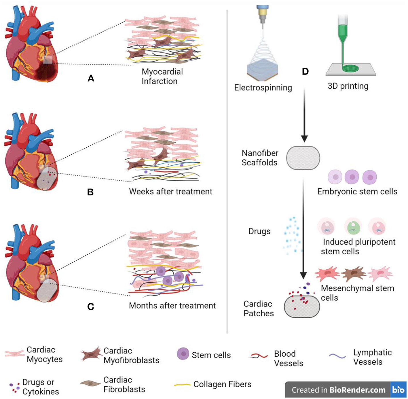 Schematic diagram of cardiac patch repairing myocardial infarction. (A) When myocardial infarction occurs, collagen fibers proliferate and form scar tissue. (B) Several weeks after treatment. (C) Several months after treatment. (D) Cardiac patch is made by electrospinning combined with 3D printing technology. The patch simulates extracellular matrix (ECM) to provide mechanical support for cells. Created with BioRender.com.