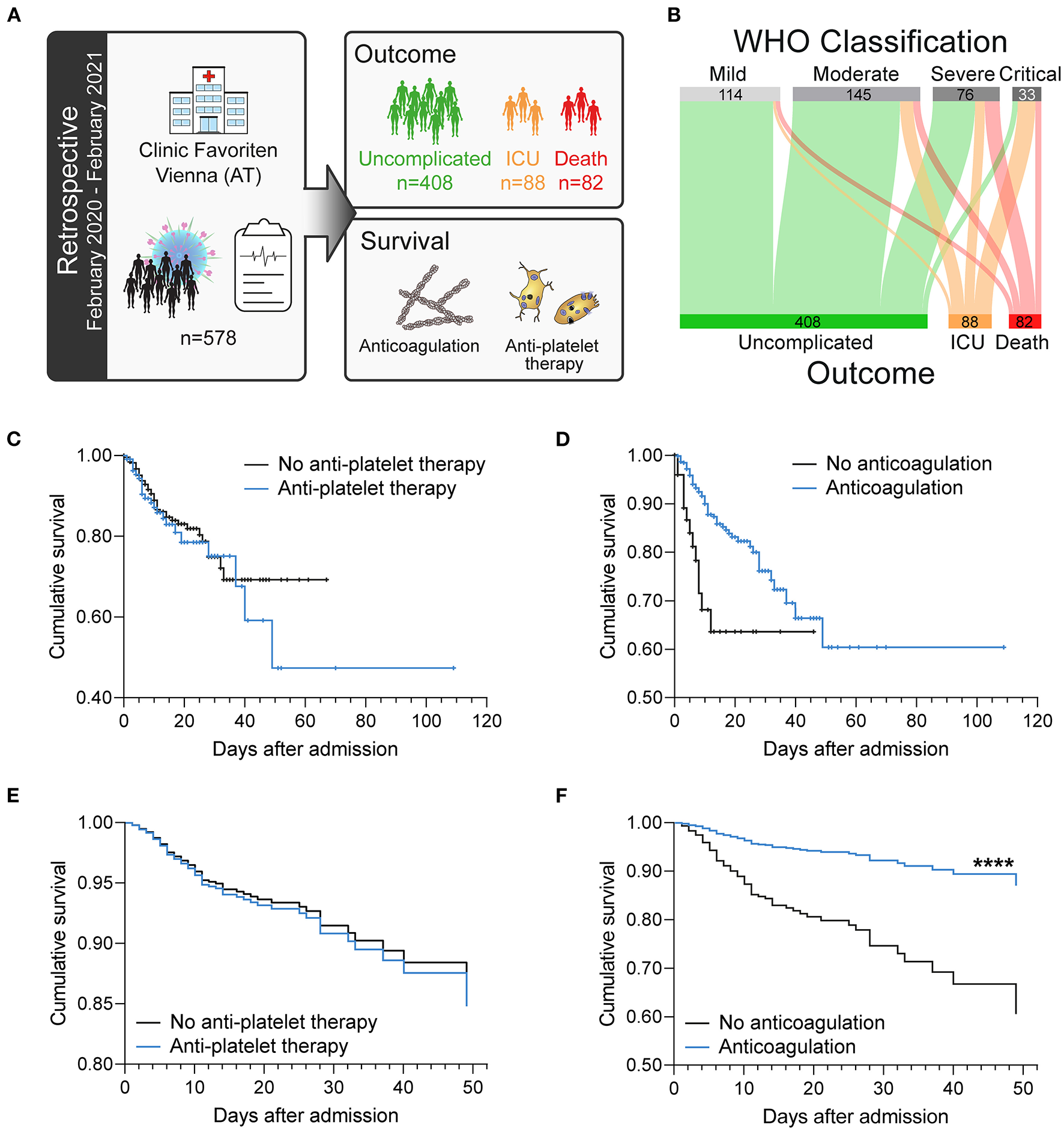 Antiplatelet therapy does not affect the survival of patients with COVID-19 in a retrospective analysis after adjusting for age. (A) Retrospective study design: 578 consecutive patients with confirmed SARS-CoV-2 infection admitted to the primary COVID-19 hospital in Vienna, Austria were included in this longitudinal study and retrospectively analyzed. (B) Severity classification according to WHO guidelines is not stringent for fatal outcome. (C–F) Effect of (C,E) antiplatelet therapy (aspirin and/or P2Y12 blockers) or (D,F) anticoagulation (LMWH and/or NOAC) on survival. (C,D) Kaplan–Meier curves. (E,F) Age-adjusted COX regression analysis. ****p < 0.0001. n = 578 patients.