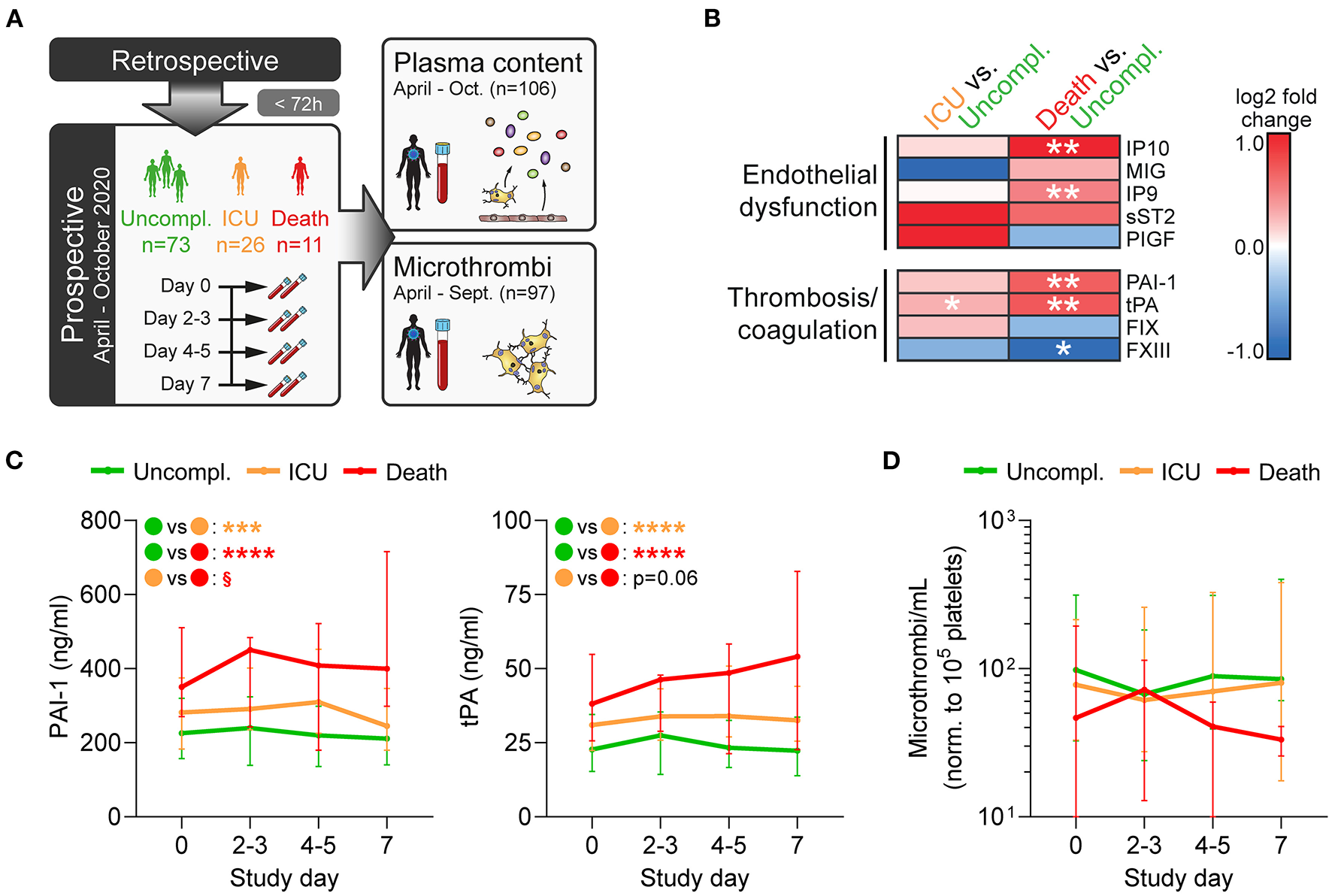 Blood was collected every 2–3 days over 1 week following study inclusion for the assessment of circulating microthrombi by flow cytometry and of plasma components by multiplex analysis. Blood draws were not part of clinical routine and thus were skipped if a patient was anemic (hemoglobin < 11 g/dl).
