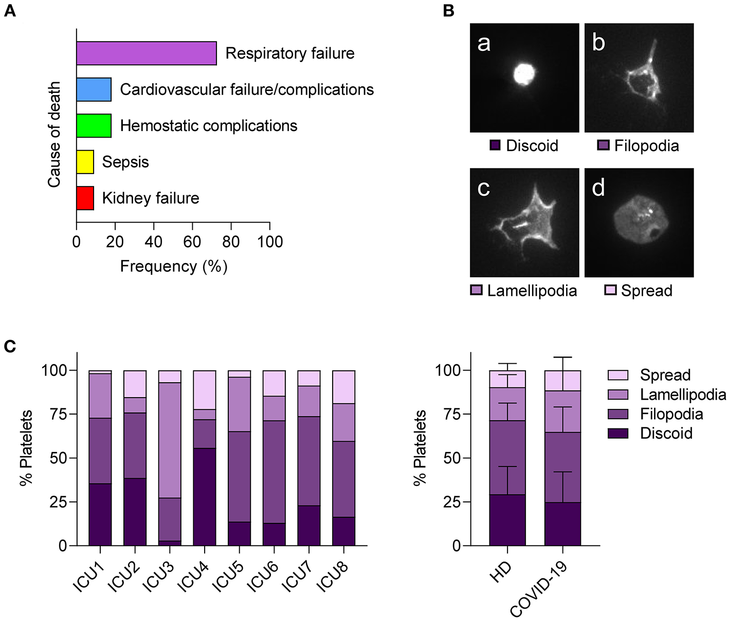 Channel μ-slides VI0.4 (ibidi) were coated with fibrinogen (100 μg/ml, 1 h at 37°C), washed with PBS and water, and left to dry. Washed platelets from healthy naïve donors or patients with COVID-19 requiring ICU treatment were prepared as described above. Platelets were resuspended in PBS at 7% density of PRP (1.4 ml PBS per 100 μl PRP), seeded into channel slides, and allowed to attach and spread for 30 min before fixation with 1% formaldehyde. Platelets were permeabilized with 0.5% Triton-X100 (4 min), blocked with 10%FBS/1% BSA (1 h), and stained with α-CD42b-AlexaFluor488 (1:50) over night at 4°C before mounting in PBS/glycerol (1:6). Pictures of at least 100 platelets per donor were taken at 100 x magnification using Nikon A1 plus confocal laser-scanning microscope and NIS software. Platelet shape of individual platelets was classified into four categories using a CellProfiler pipeline: discoid, filopodia-forming, lamellipodia-forming and fully spread.