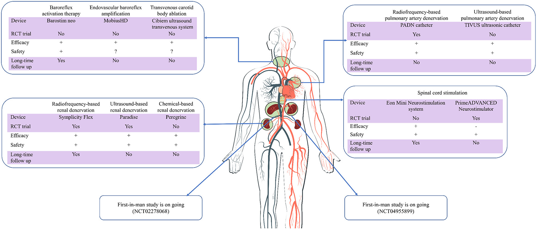 Current evidence of device-based sympathetic nerve regulation in cardiovascular diseases. RCT, randomized controlled trial; Long-time, longer than 1 year; +/–/?, positive/negative/uncertain results.