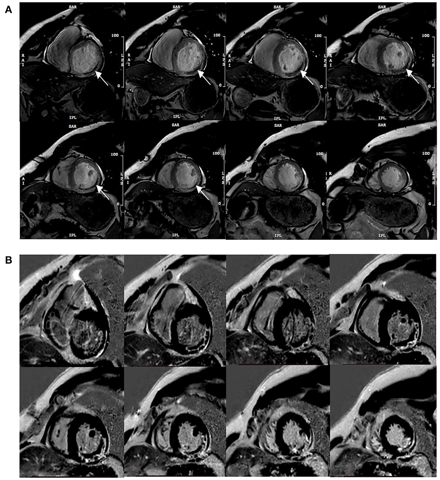 Typical MVO appearance on contrast-enhanced cine (CE-SSFP) imaging at the same slice position during the cardiac cycle (A), and the corresponding LGE images (B). Arrows point to the dark area surrounded by the hyperintensity infarction zone constantly visible and located at the same position within the cardiac wall on each SSFP image during the cardiac cycle.