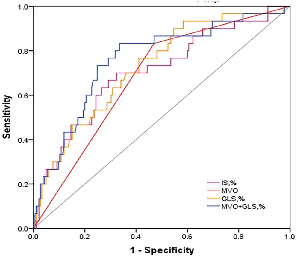 After 13 months of follow-up [interquartile range (IQR): 11–24], 30 patients (14%) developed MACE; the MVO (hazard ratio (HR) was 3.10; 95% CI: 1.14–8.99, p = 0.028), and the infarct size (IS) (HR: 1.03; 95% CI: 1.0–1.06, p = 0.042) and global longitudinal strain (GLS) (HR: 1.08; 95% CI: 1.01–1.17, p = 0.029) were finally associated with MACE. Receiver operating characteristic (ROC) analyses show that the area under the curve (AUC) of GLS was large (0.73 [95% CI, 0.63–0.82], p = 0.001), and the best cut-off was −11.8%, with 76.7% sensitivity and 58.9% specificity, which are greater than those of IS (0.70, 95% CI, 0.60–0.81, p < 0.001) and MVO (0.68, 95% CI, 0.58–0.78, p < 0.001). However, combining MVO and GLS resulted in a much greater finding (AUC = 0.775, 95% CI: 0.727–0.824, p < 0.001) and better sensitivity and specificity (83.3%, 66.5%).
