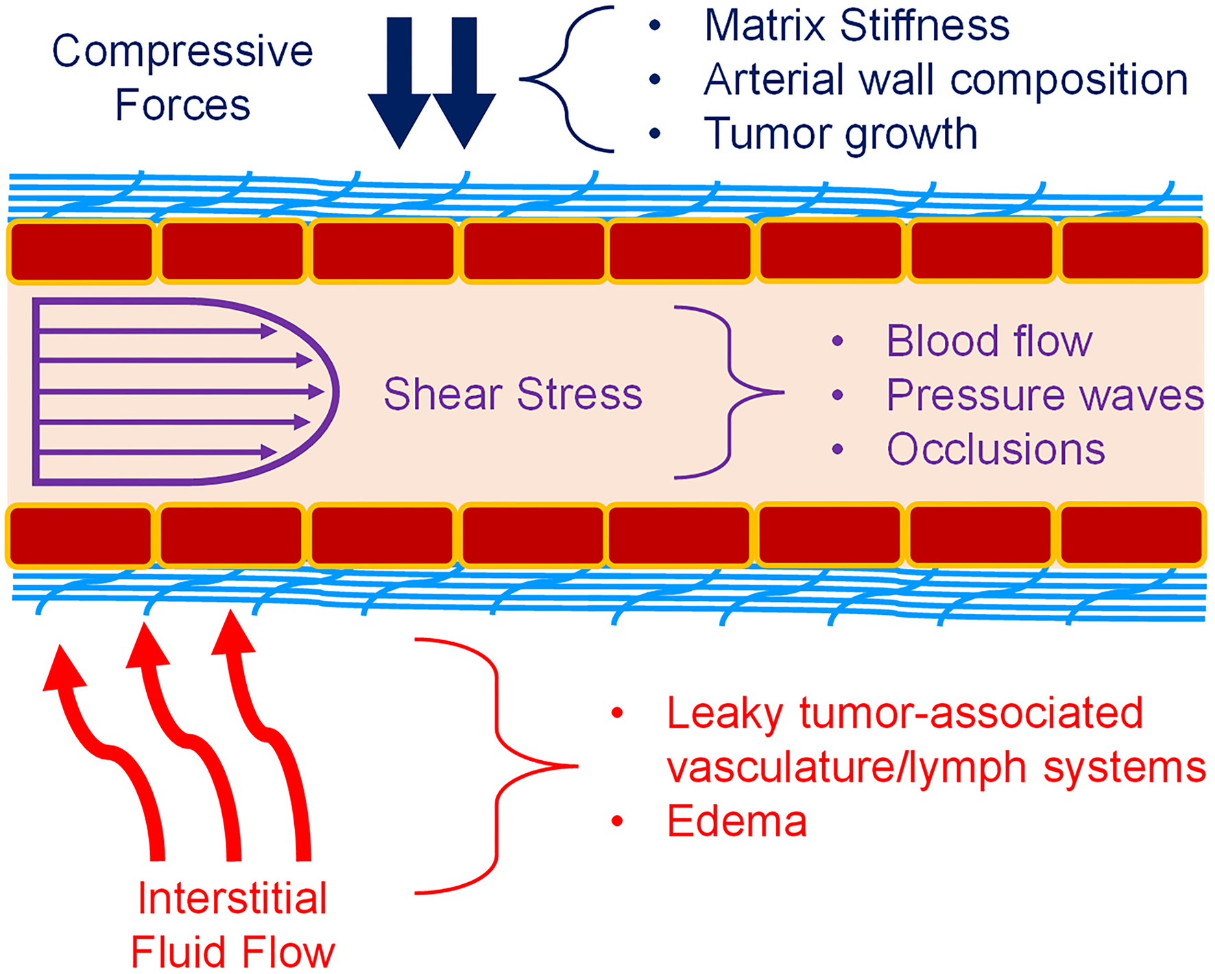 Mechanical forces in blood vessels. Vascular ECs (red boxes) experience a variety of forces. Compressive forces (blue) can be caused by matrix (light blue) stiffness, tumor expansion, and surrounding cells. Shear stress (purple) caused by blood flow is also a major component of the vascular environment. Pulsatile flow and atherosclerosis also affect fluid flow and the resulting shear stress. Interstitial fluid flow and pressure (red) is also present during angiogenesis, and especially in the TME. Permeable vasculature is commonly present in disease states such as tumors and edema. Figure was derived based on the following references: (1–13).