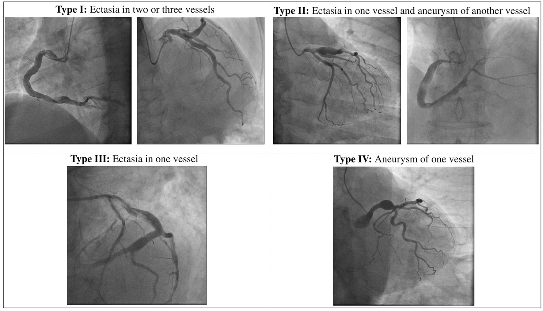 To date the definition of CAE remains uncertain: the lexical variability prevents to accumulate the data for robust scientific evidence on this issue. The mainstream of the literature directs the nomenclature on the basic distinction between the terms ectasia and aneurysm that, although sometimes used as synonyms, represent two different phenotypes of the disease: while the first one identifies a diffuse dilatation that involves > of 50% of the length of the vessel, the term coronary artery aneurysm (CAA) refers a focal dilatation (10). CAAs are also subclassified into saccular if the transverse diameter exceeds the longitudinal diameter, and fusiform in the opposite case. Giant CAAs are defined instead as a dilatation with a diameter >20 mm or if the diameter exceeds the reference vessel diameter by >4 times in adults, while in children if the diameter is >8 mm (11, 12). Moreover, according to the integrity of the vessel architecture, CAAs can be also divided into true or pseudoaneurysms. While true CAAs involve the three layers of vessel tunica, pseudoaneurysms are single- or double-layer dilatations that occurs after the disruption of the media and external elastic membrane, usually caused by blunt chest trauma or mechanical damage during PCI (13–15). A topographical classification of CAE was proposed by Markis et al. Briefly, CAE is divided into 4 anatomical phenotypes according to its extension in the coronary tree: diffuse ectasia of two or three vessels is classified as type I, diffuse ectasia in one vessel and focal dilatation in another vessel as type II, diffuse ectasia of one vessel only and focal aneurysm as type III and IV, respectively (16). Angiographical subtypes according to Markis classification are shown in Figure 1.