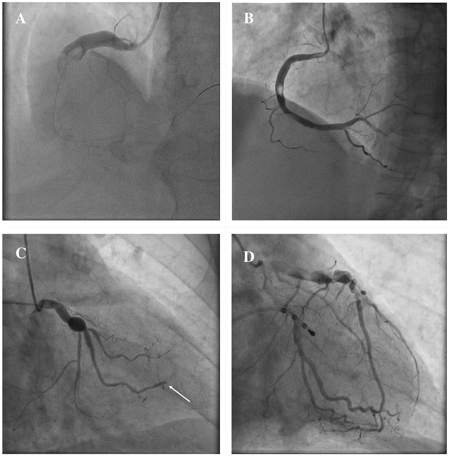 Mechanisms of ACS in patients with CAE. ACS in patients with CAE can occur through different pathophysiological mechanisms. Catastrophic plaque rupture resulting in acute vessel occlusion due to a huge thrombotic burden untreatable despite a timely primary PCI (A). Relevant filling defect due to endoluminal thrombus without significant underlying atherosclerotic plaque, to be ascribed to flow disturbances in an entirely ectatic RCA (B). Abrupt flow occlusion of the distal segment in a marginal branch (arrow) due to the embolization of clot fragments coming from a proximal saccular CAA of the LCx (C). Ectatic LAD showing images of advanced flow disturbances angiographical pattern, that suggest the relationship between impaired blood progression and myocardial ischemia (D). ACS, Acute Coronary Syndrome; CAA, coronary artery aneurysm; CAE, Coronary Artery Ectasia; LAD, left anterior descending; LCx, left circumflex; PCI, percutaneous coronary intervention; RCA, right coronary artery.
