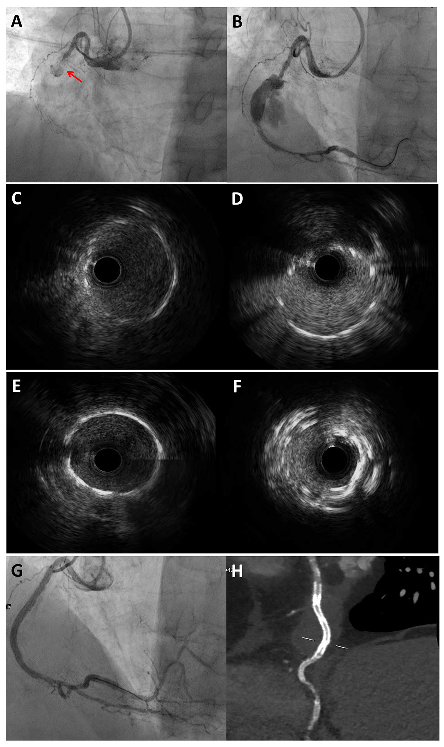 Multimodality imaging approach for diagnosis and PCI guidance in a STEMI patient with angiographic evidence of CAE. 77-year-old man admitted for STEMI, who underwent emergent coronary angiography. Coronary angiography showed an occlusion of the mid RCA due to stent thrombosis (A) and a CAA distal to the occlusion site, which was visible after guidewire crossing and thrombectomy (B). IVUS evaluation showed the previously implanted stents at the proximal (C) and distal (D) necks of the CAA. The PCI strategy consisted of 48 mm EES implantation bridging the proximal and distal CAA necks to create a supporting platform for the deployment of two overlapping covered stents. (E) and (F) show the proximal and distal edges of the EES assessed by IVUS. Coronary angiography showed an optimal sealing of the CAA after the implantation of two overlapping 3.5 × 24 mm single-layer PTFE covered stents (BeGraft, Bentley InnoMed, Hechingen, Germany) (G), which was confirmed by CCTA after the procedure (H). *Courtesy of Dr. Iacopo Muraca. CAA, coronary artery aneurysm; CCTA, coronary computed tomography angiography; EES, everolimus-eluting stent; IVUS, intravascular ultrasound; PTFE, polytetrafluoroethylene; RCA, right coronary artery; STEMI, ST-segment elevation myocardial infarction.