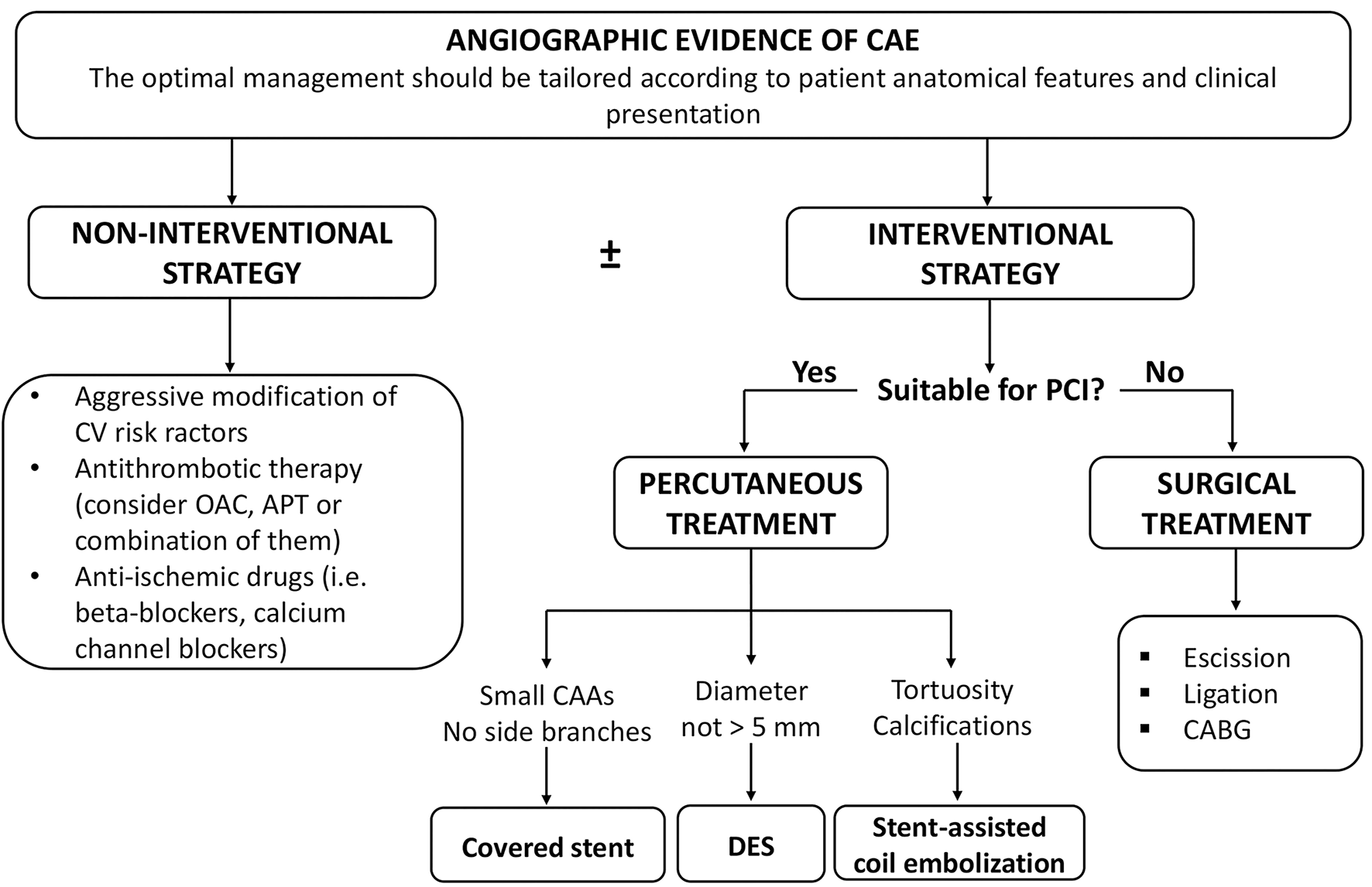 Clinical management of patients with CAE. APT, antiplatelet therapy; CAAs, coronary artery aneurysms; CABG, coronary artery bypass grafting; CAE, coronary artery ectasia; CV, cardiovascular; DES, drug-eluting stent; OAC, oral anticoagulation; PCI, percutaneous coronary intervention.