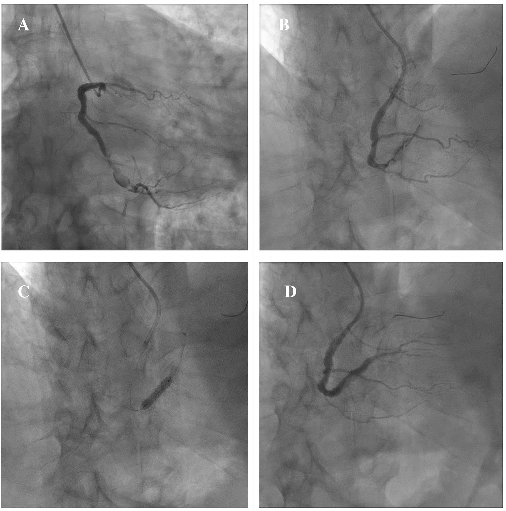 Example of exclusion of a saccular CAA in the distal RCA with high thrombus burden by means of covered stent implantation. Severe ISR of a previously implanted DES in the distal segment of the RCA continuing in a saccular CAA with high thrombus burden (A). A 3.5 × 15 mm PK Papyrus covered stent is advanced to precisely seal the inlet and outlet of the CAA (B). A DES Synergy (Boston Scientific, Marlborough, Massachusetts) 4 x 24 mm is then implanted proximally to the covered stent to treat the severe ISR (C). Final result showing the exclusion of the saccular CAA (D). CAA, coronary artery aneurysm; DES, drug-eluting stent; ISR, in-stent restenosis; RCA, right coronary artery.