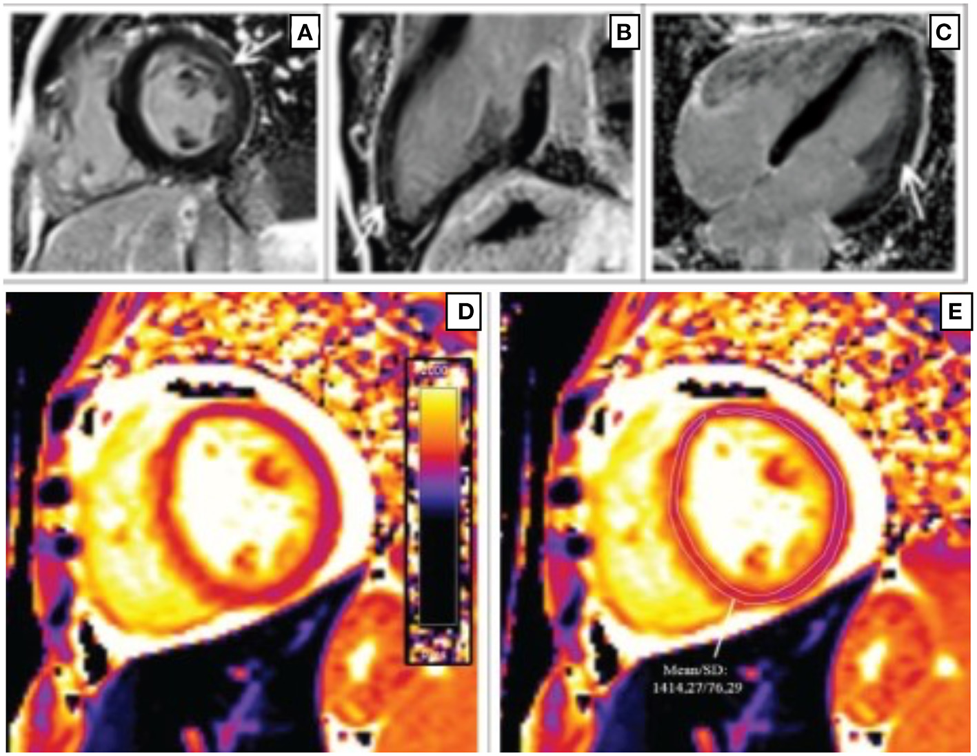Short-axis (A), 2-chamber (B), and 4-chamber (C) late gadolinium phase-sensitive inversion recovery images show linear mid-wall enhancement in the lateral wall of the LV (white arrows) in a patient with HIV. T1 map at the level of the mid-LV (D) shows a markedly elevated myocardial T1 time of 1,414 m/s (normal 1,052 m/s ± 23 m/s at 3 T) (E) consistent with diffuse myocardial fibrosis (29).
