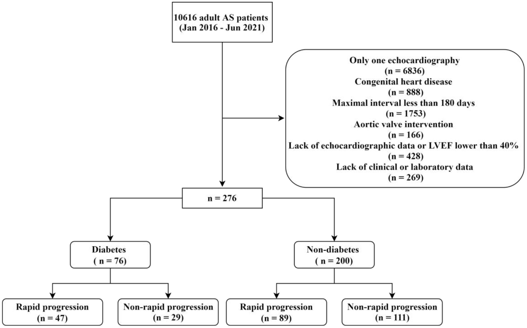 We retrospectively analyzed 276 AS patients who underwent transthoracic echocardiography at least twice with a maximum interval ≥ 180 days from January 2016 to June 2021. AS severity was defined by specific threshold values for peak aortic jet velocity (Vmax) and/or mean pressure gradient. An increase of Vmax ≥ 0.3 m/s/year was defined as rapid progression. The binary Logistic regression models were used to determine the association between diabetes and rapid progression of AS.