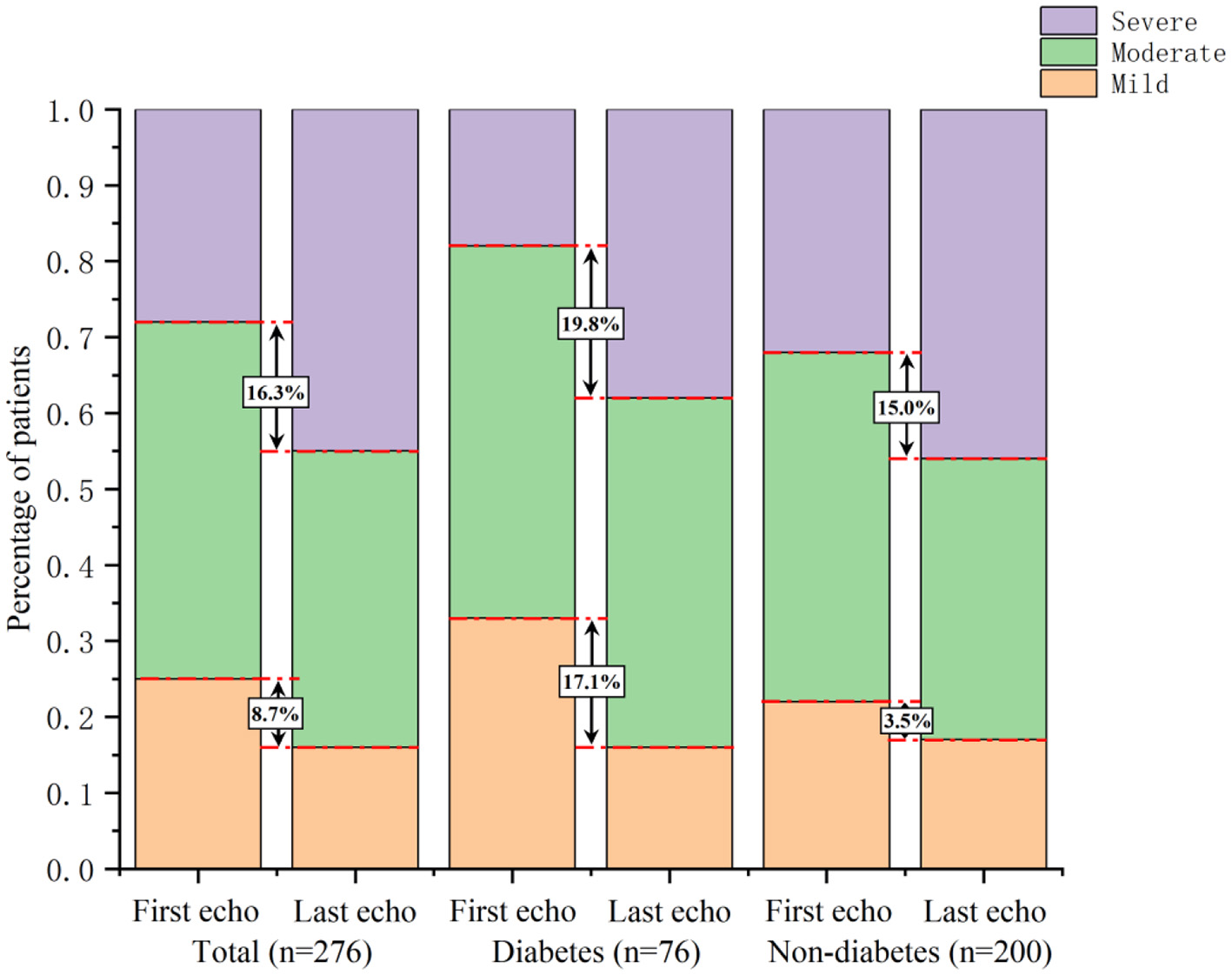 At follow-up, the proportion of patients with severe AS increased by 16.3%, while the proportions of patients with mild and moderate AS decreased by 8.7% and 7.6%, respectively. In the 76 diabetic patients, the proportion of moderate-to-severe AS increased by 17.1%, and particularly, severe AS increased by 19.8%. In the patients without diabetes, the proportion of moderate-to-severe AS increased by 3.5%, and severe AS increased by 15.0% (Figure 2).