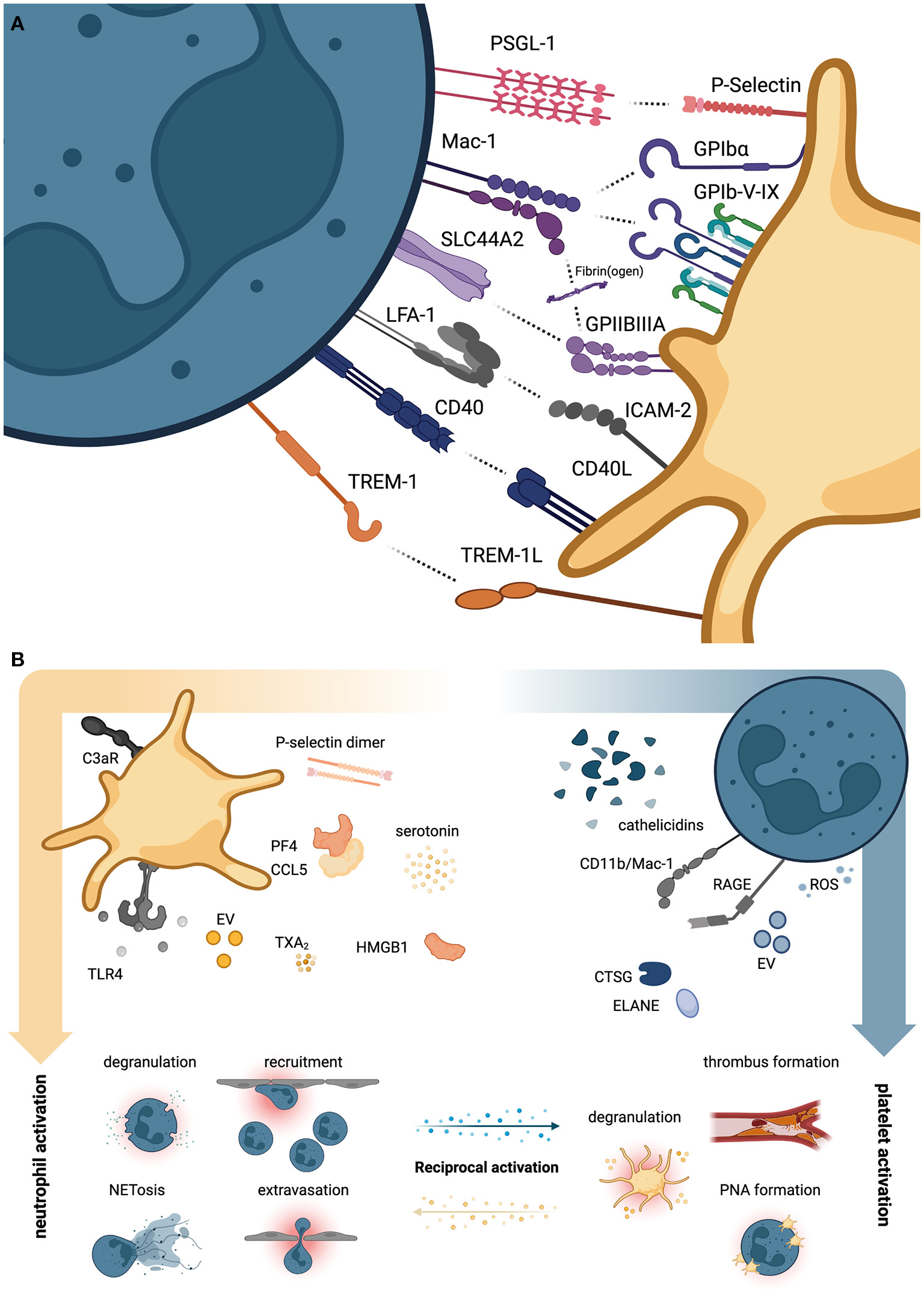 Direct and indirect platelet-neutrophil interactions. (A) Overview of neutrophil (left, petrol) and platelet receptor pairs (right, yellow) that directly engage and promote reciprocal activation of either cell type. (B) Overview of soluble agonists secreted by platelets promoting neutrophil activation (left panel) and vice versa (right panel). CTSG, cathepsin G; ELANE, neutrophil elastase; EV, extracellular vesicles; HMGB1, High mobility group box 1; ROS, reactive oxygen species; TXA2, thromboxane A2. Created with BioRender.com.
