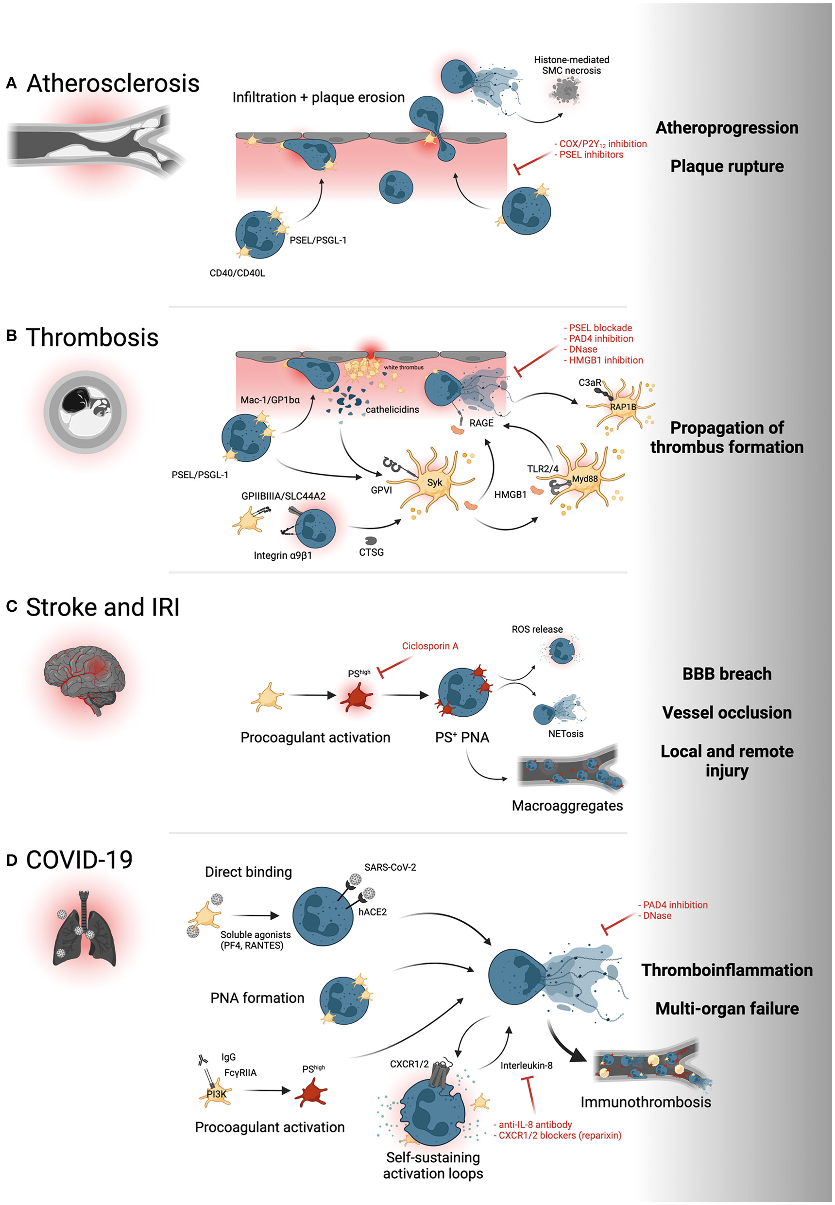 Platelet-neutrophil interactions in cardiovascular disease. (A) PSEL/PSGL-1- and CD40L/CD40-dependent recruitment of neutrophils to the atherosclerotic plaque promotes neutrophil infiltration and subsequent destabilization of the plaque, for instance through histone-mediated cell death of smooth muscle cells (SMC). (B) Both arterial and venous thrombosis are promoted by PNA formation and reciprocal activation of platelets and neutrophils through GPVI/cathelicidin, GPIIBIIIA/SLC44A2, HMGB1/RAGE, HMGB1/TLR and complement/C3aR interactions. Syk, Syk family kinase; RAP1B, Ras-related protein Rap-1b; Myd88, Myeloid differentiation primary response 88. (C) Inflammatory responses in stroke and ischemia-reperfusion injury induce procoagulant platelet activation (red) and formation of phosphatidylserine (PS)+ PNAs that promote neutrophil activation and infiltration and propagate thrombus formation through platelet-neutrophil macroaggregates. (D) Direct binding of SARS-CoV-2 to either platelets or neutrophils, subsequent PNA formation and hyperactivation, IgG-mediated procoagulant platelet activation and IL-8 mediated neutrophil self-stimulation all promote NET formation and systemic thromboinflammation associated with severe COVID-19. PI3K, Phosphoinositide 3-kinase; CXCR1/2, C-X-C motif chemokine receptor 1/2. Yellow intravascular cells depict proinflammatory monocytes. Created with BioRender.com.