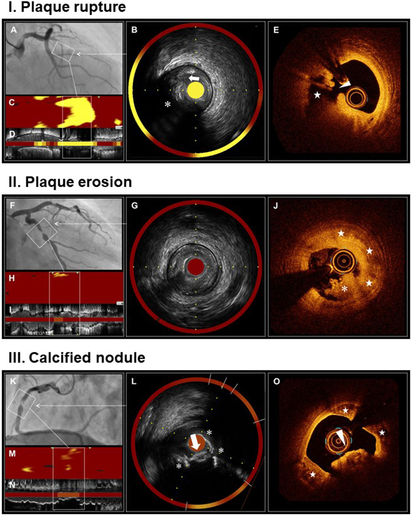 Multimodality imaging of plaque rupture, plaque erosion, and calcified nodule. Plaque rupture (I) Angiogram shows occlusion of proximal LAD, the culprit lesion of STEMI (A). IVUS demonstrates ulceration (arrow) with a recess on the surface of attenuated plaque (asterisk) (B,D). NIRS identifies a large lipid content (maxLCBI4mm = 920) (B–D). OCT reveals plaque rupture characterized by a fibrous cap disruption (arrowhead) and a cavity (star) formation inside the plaque (E). Plaque erosion (II) Angiogram shows severe stenosis in mid LCX, the culprit lesion of STEMI (F). IVUS demonstrates the absence of plaque ulceration (G,I). NIRS identifies a small lipid content (maxLCBI4mm = 129) (G–I). OCT reveals plaque erosion characterized by the presence of attached thrombus (asterisk) overlying an intact fibrotic plaque (stars) (J). Calcified nodule (II) Angiogram shows severe stenosis and intraluminal filling defect in mid RCA, the culprit lesion of non-STEMI (K). IVUS demonstrates a convex calcium with irregular surface (arrow) and large superficial calcium (asterisks) (L,N). NIRS identifies a moderate lipid content (maxLCBI4mm = 208) (L–N). OCT reveals calcified nodule characterized by a protruding calcium with thrombi (arrowhead) and large superficial calcium (stars) (O). IVUS, intravascular ultrasound; LAD, left anterior descending artery; LCBI, lipid core burden index; LCX, left circumflex artery; NIRS, near-infrared spectroscopy; OCT, optical coherence tomography; RCA, right coronary artery; STEMI, ST-segment elevation myocardial infarction.