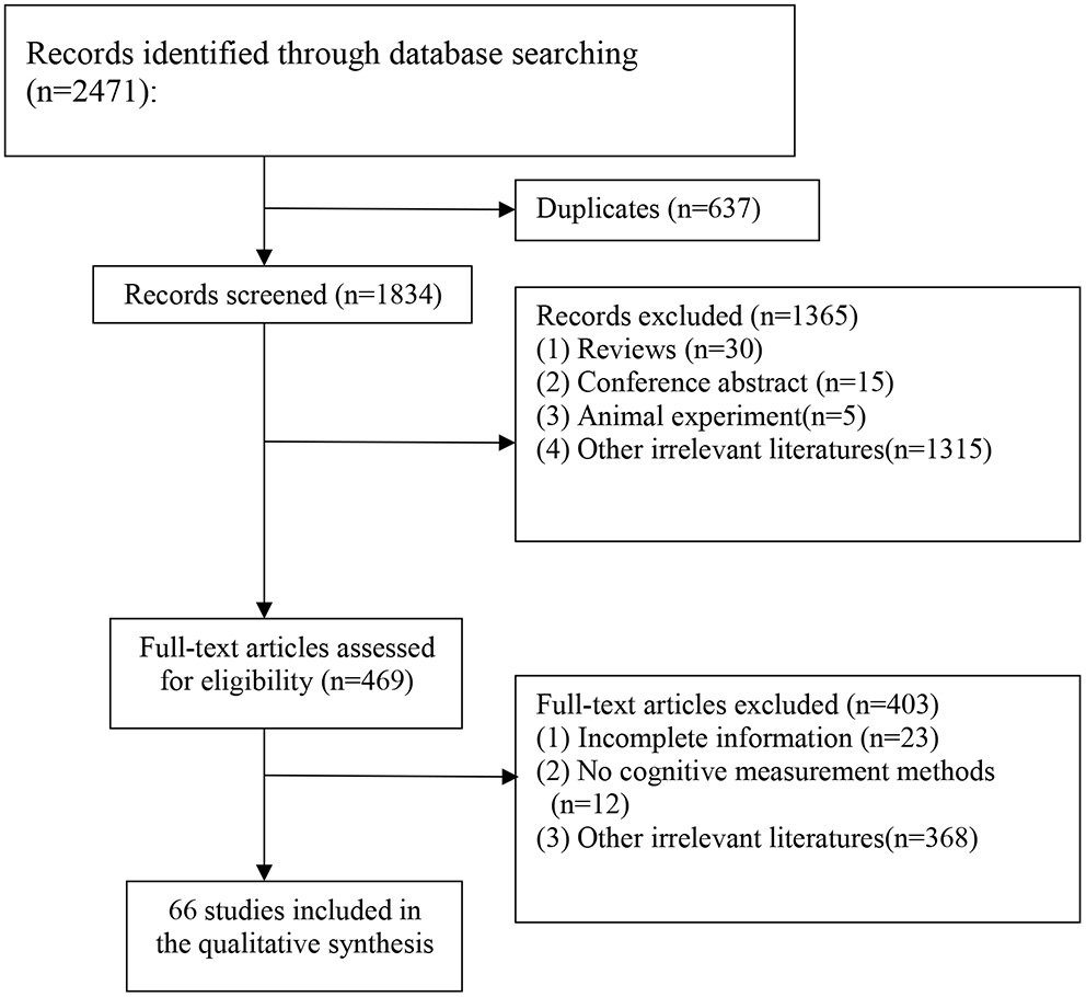 A total of 2,471 records were identified from four electronic databases, and 637 duplicate articles were removed. Following evaluation of titles and abstracts, 1,365 articles were excluded. A total of 403 articles were excluded of the 469 remaining articles, following investigation of the full text. Finally, 66 studies (18–83) were included in the analysis, involving a total of 33,579 patients. The flow chart (Figure 1) indicates the search process and study selection.