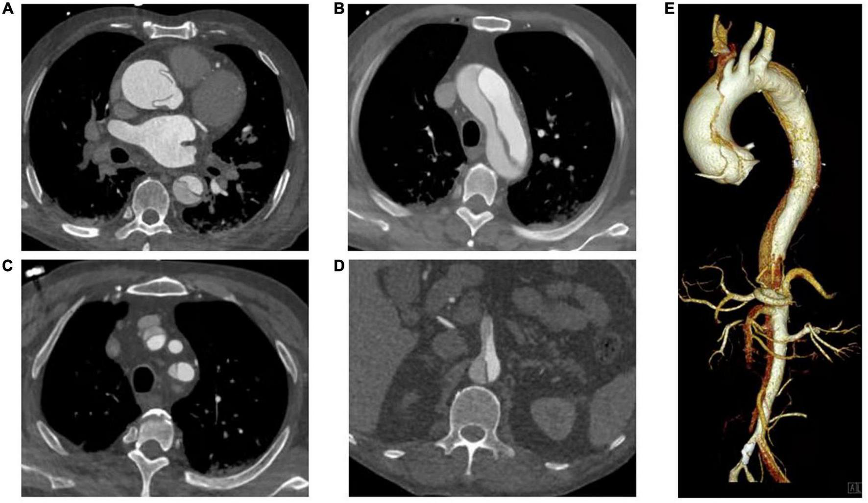 CT Angiography of the Aorta. (A) Ascending aorta; (B) Aortic arch; (C) Branch of aortic arch (involving brachiocephalic trunk and left subclavian artery); (D) Aortic dissection involving superior mesenteric artery; (E) Volumetric CT scanning: 3D reconstruction.