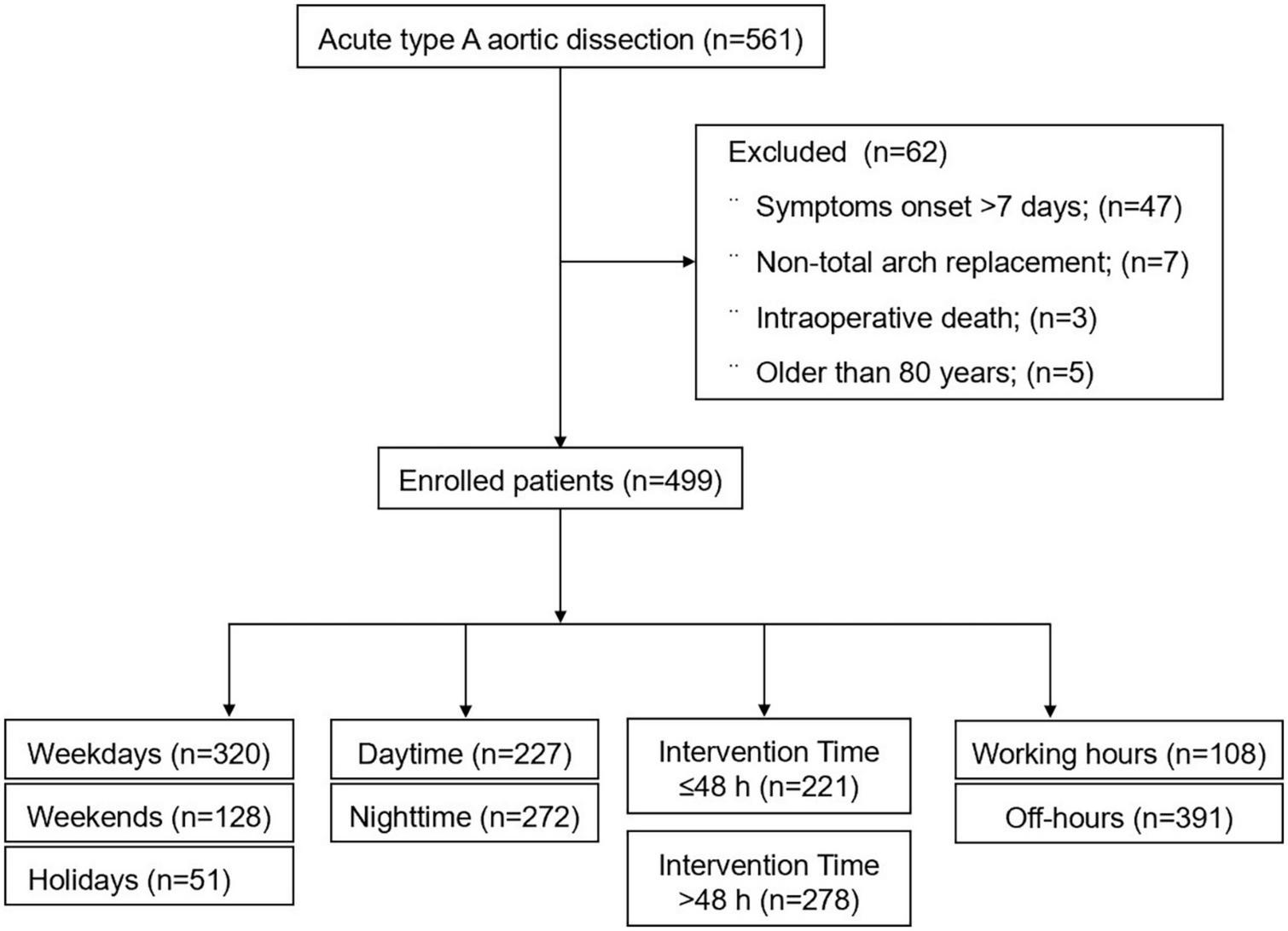 Patients with ATAAD who underwent total arch replacement at Qilu Hospital of Shandong University from January 2015 to March 2022 were retrospectively analyzed. All patients were managed according to the green channel emergency management strategy, and a professional cardiac team was arranged during off-hours. Based on surgery time and symptom onset to procedure time, the patients were divided into weekday, weekend and holiday groups; daytime and nighttime groups; intervention time ≤48 h and >48 h groups; working hours and off-hours groups. In-hospital mortality between these groups was compared.