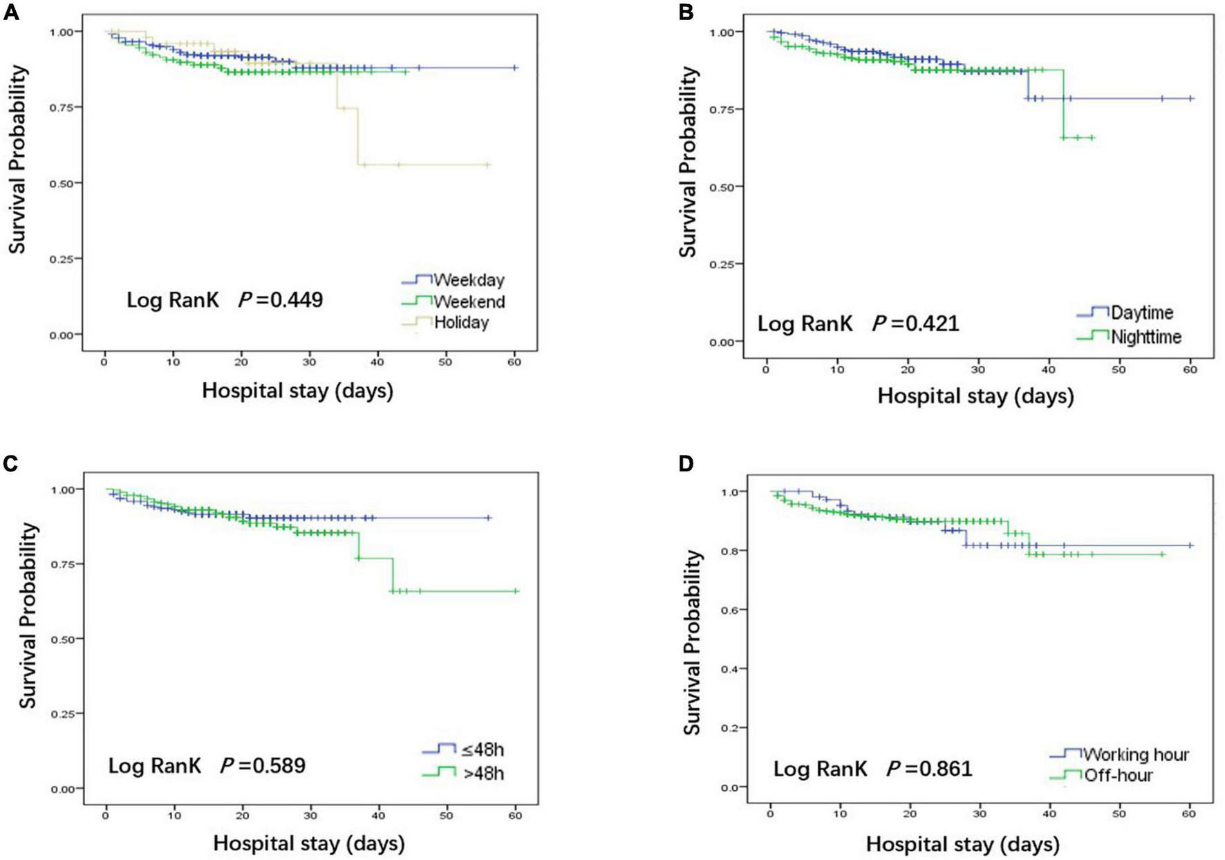 Unlike other studies, which grouped patients according to the date of admission (8, 9, 12), we divided patients into the following three groups according to the surgery date and the Chinese legal holidays of the current year: weekdays, weekends and holidays. Based on the data of the patients operated on weekdays, the mortality risk of patients operated on during weekends and holidays was compared.