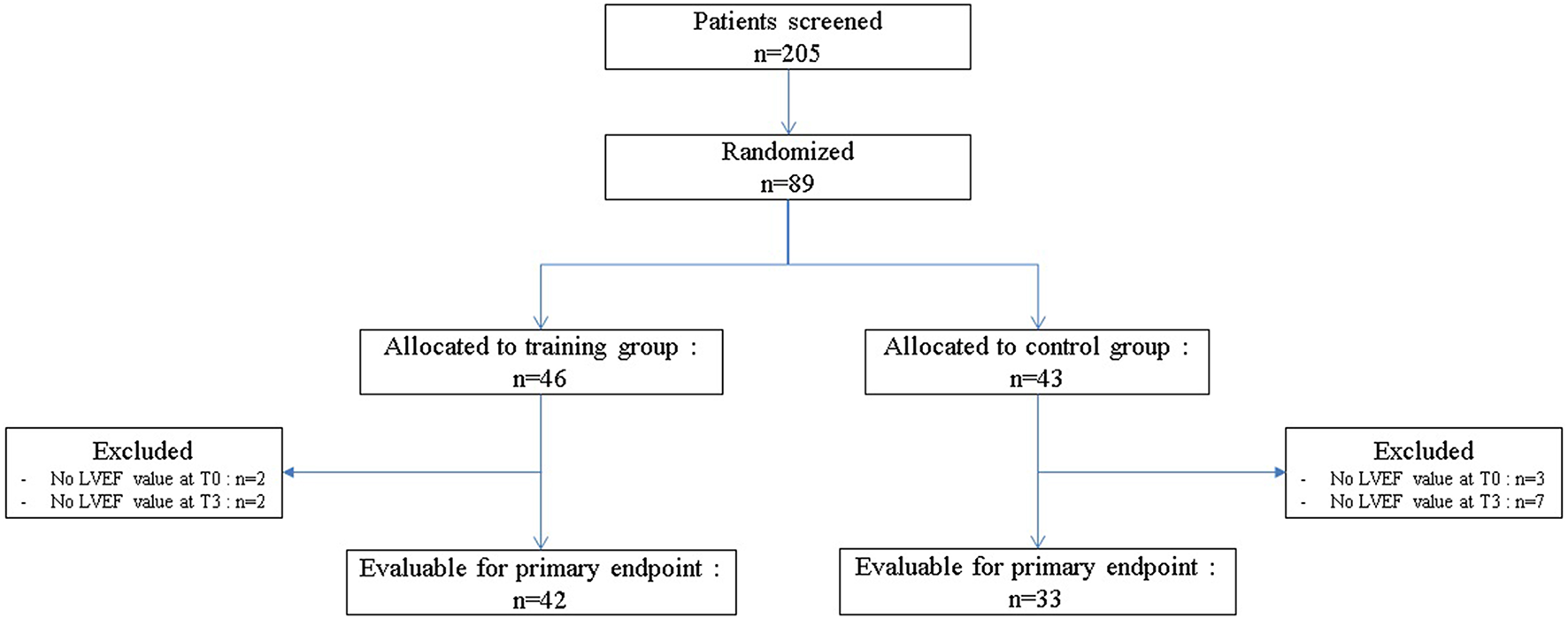 89 women were randomized to receive adjuvant trastuzumab in combination with a training program (training group: TG; n = 46) or trastuzumab alone (control group: CG; n = 43). The primary and secondary endpoints were evaluated at the end of the supervised exercise program of 3 months (T3).