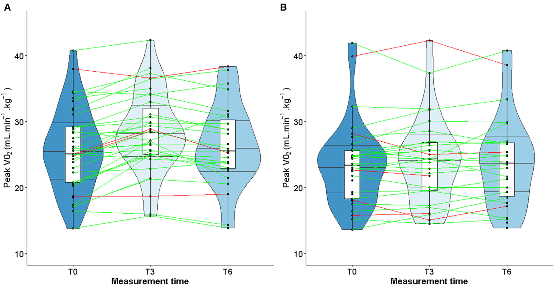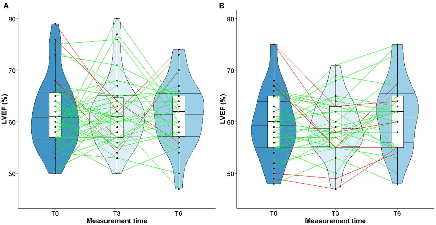 Qualitative variables were described as number and percentage, and quantitative variables as median with interquartile range (IQR) or median with range (Min-Max) for age. Echocardiography variables and cardiorespiratory parameters at maximal exercise were described as mean ± standard deviation (SD) at T0, T3 and T6. Differences over time were described as the difference in means, with 95% confidence interval (CI). Violin plots were used to obtain a longitudinal representation of data during follow up. The Wilcoxon-Mann-Whitney test was used to compare median values of LVEF (according to criterion 1) and cardiorespiratory parameters of patients according to the presence or absence of cardiotoxicity at T0 and T3. Spearman's correlation coefficient was used to assess the association between changes in LVEF, peak VO2 and maximal power.