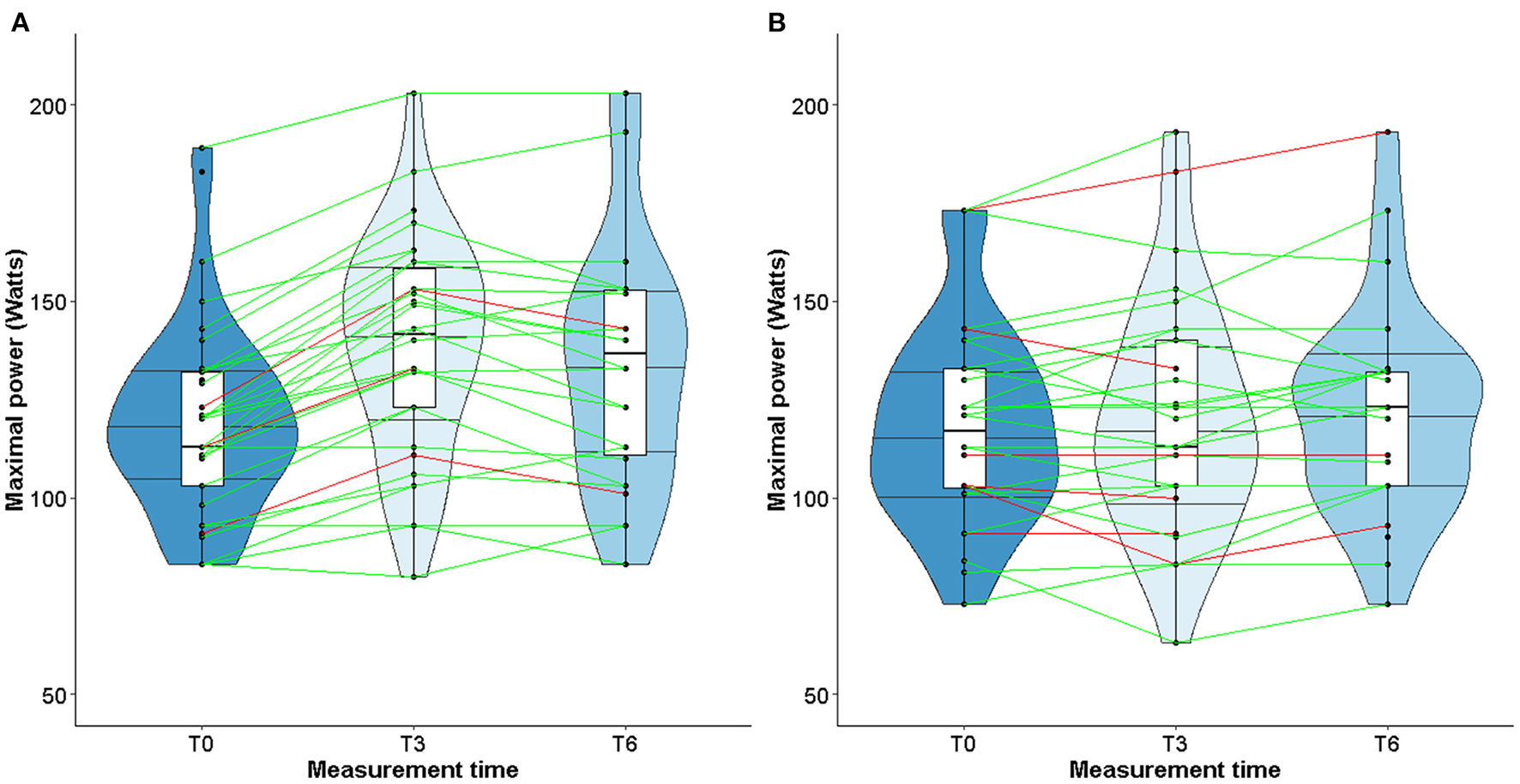 The first and second ventilatory thresholds (VT1 and VT2) were assessed from the relation between the respiratory exchange ratios (VCO2/VO2, VE/ VO2, VE/ VCO2) by two experts, in a blinded fashion, using the V-slope method according the Wasserman method (38). The mean of the two closest values was taken as the VT and the corresponding power (watts) was recorded. Power corresponding at VT1 and VT2 was used to guide intensity for the supervised exercise program.