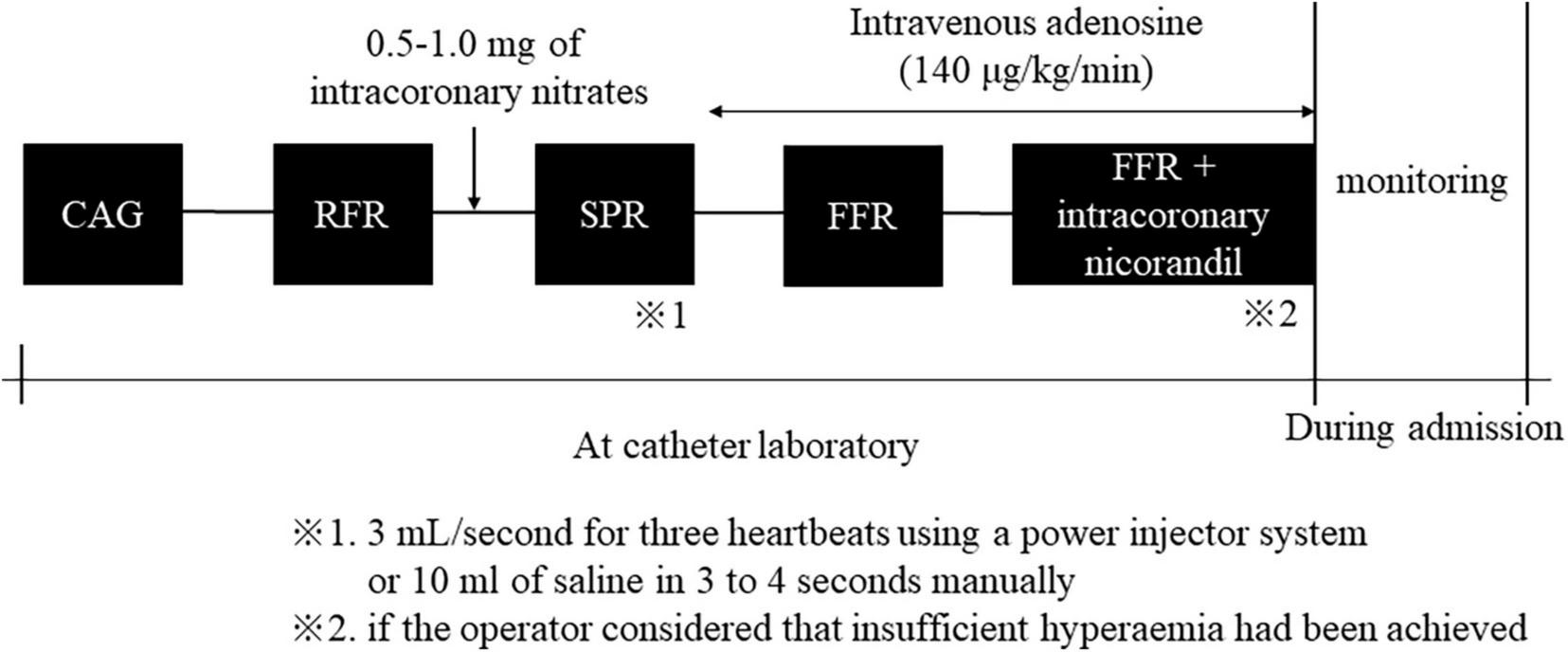 Conventional coronary angiography was performed using standard techniques via a transradial, transbrachial, or transfemoral approach (4–6 Fr). Coronary artery stenosis, defined as 50% or more stenosis, was visually diagnosed by two independent experienced interventional cardiologists at each institution. A physiological study using a pressure wire (Pressure Wire Aeris™ or Pressure Wire X™; Abbott®, USA) was also performed to assess the severity of coronary artery lesions. Hemodynamic measurements, including heart rate and aortic blood pressure, were recorded continuously throughout this procedure. Initially, the RFR was measured after the pressure wire had been advanced into the target coronary artery. After measurement of RFR, 0.5–1 mg nitrates were injected into the target coronary artery. More than 1 min after intracoronary nitrates, we evaluated SPR immediately after injecting an intracoronary bolus of saline at room temperature at 3 mL/s for three heartbeats through the catheter using a power injector system or 10 ml of saline in 3–4 s manually. SPR was defined at the inflection point between rapid increase and plateau. Finally, we evaluated FFR during peak hyperemia induced by intravenous infusion of adenosine (140 μg/kg/min). If the operator considered that insufficient hyperemia had been achieved, the FFR was measured again after intracoronary administering 2 mg of nicorandil. We monitored the patient’s symptoms and any complications during and after these procedures. Outline of pressure measurements protocol is shown in Figure 1.