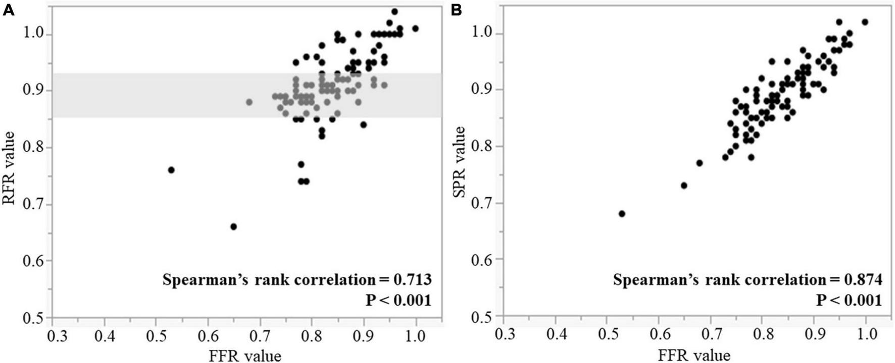 Correlations between RFR and FFR (A), and SPR and FFR (B). Gray shaded area is the RFR gray zone of 0.86–0.93. RFR, resting full-cycle ratio; SPR, saline-induced Pd/Pa ratio; FFR, fractional flow reserve.