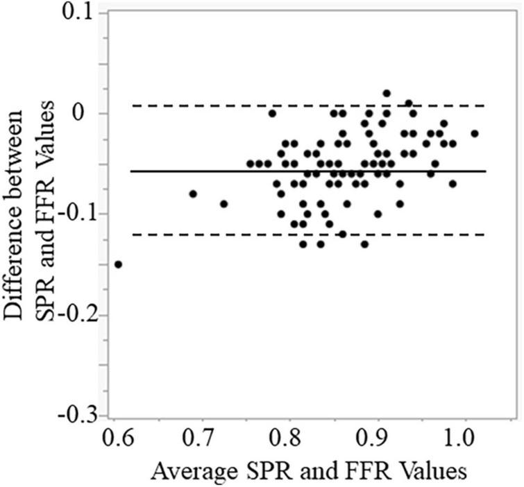 Bland–Altman plots showing agreement between SPR and FFR. SPR, saline-induced Pd/Pa ratio; FFR, fractional flow reserve.