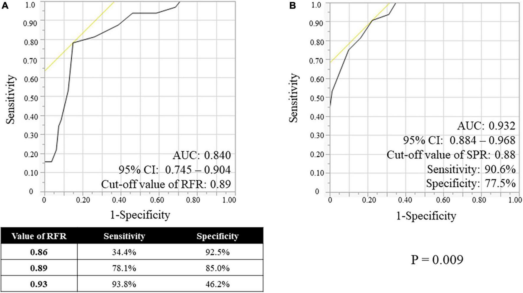 Receiver-operating characteristic (ROC) curves of the RFR (A) and the SPR (B), using FFR < 0.80 as the reference standard variable. RFR, resting full-cycle ratio; SPR, saline-induced Pd/Pa ratio; FFR, fractional flow reserve; AUC, area under the curve; CI, confidential interval.