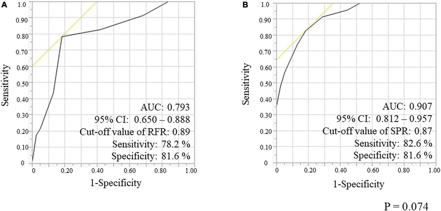 We evaluated the ROC curves for RFR and SPR in a lesion subgroup with gray zone of RFR consisting of 61 lesions (54.5%) (Figure 5). The AUC for RFR and SPR was 0.793 and 0.907, respectively, and the AUC value for SPR was higher than that for RFR (p = 0.074). The cut-off value for RFR was 0.89 with sensitivity and specificity of 78.2 and 81.6%, respectively, whereas the cut-off value for SPR was 0.87 with sensitivity and specificity of 82.6 and 81.6%, respectively.