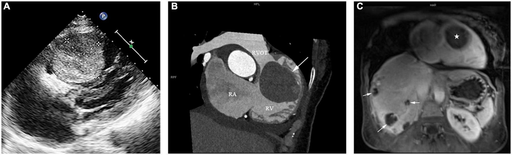 (A) Preoperative transthoracic echocardiography showing a large mass measuring 4.82 cm × 4.48 cm × 6.42 cm attached to the anterior wall of the right ventricle, with a moderate to strong and relatively homogeneous echo. (B) The computed tomography scan of the patient’s chest showing a right ventricular mass (arrow) in the right ventricular outflow tract (RVOT). RA: right atrium; RV: right ventricle. (C) Reconstructed magnetic resonance imaging of the patient’s chest and abdomen showed a cardiac mass concurrent with multiple hepatic lesions. The right ventricular mass and the multiple liver lesions are indicated by a star and three arrows, respectively.