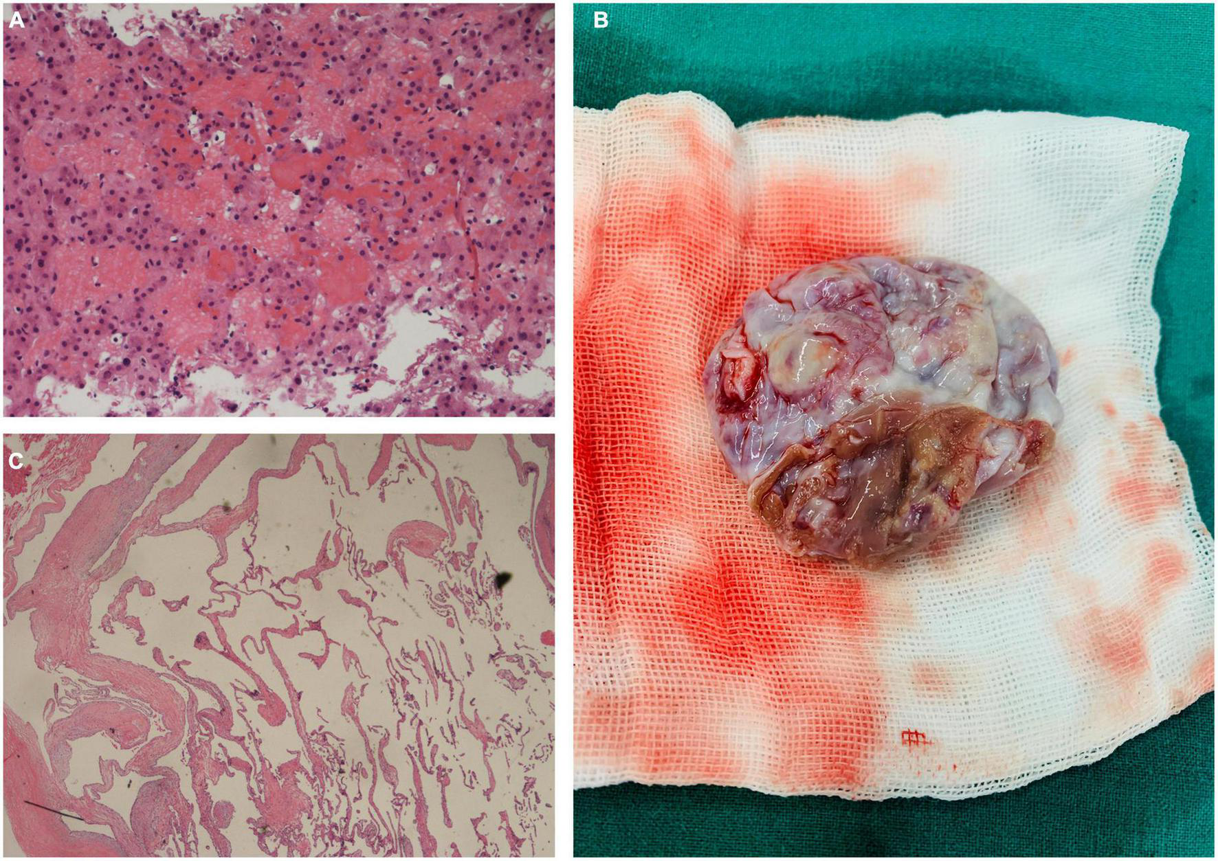 (A) Pathological examination of the liver mass showing multiple irregular dilatated vascular spaces and layers of endothelial cells without signs of malignancy (Hematoxylin and eosin, × 200). (B) Intraoperative photograph of the excised specimen appeared as a cystic mass with a broad base and intact capsule. (C) Pathological evaluation of the cardiac mass (Hematoxylin and eosin, × 100).