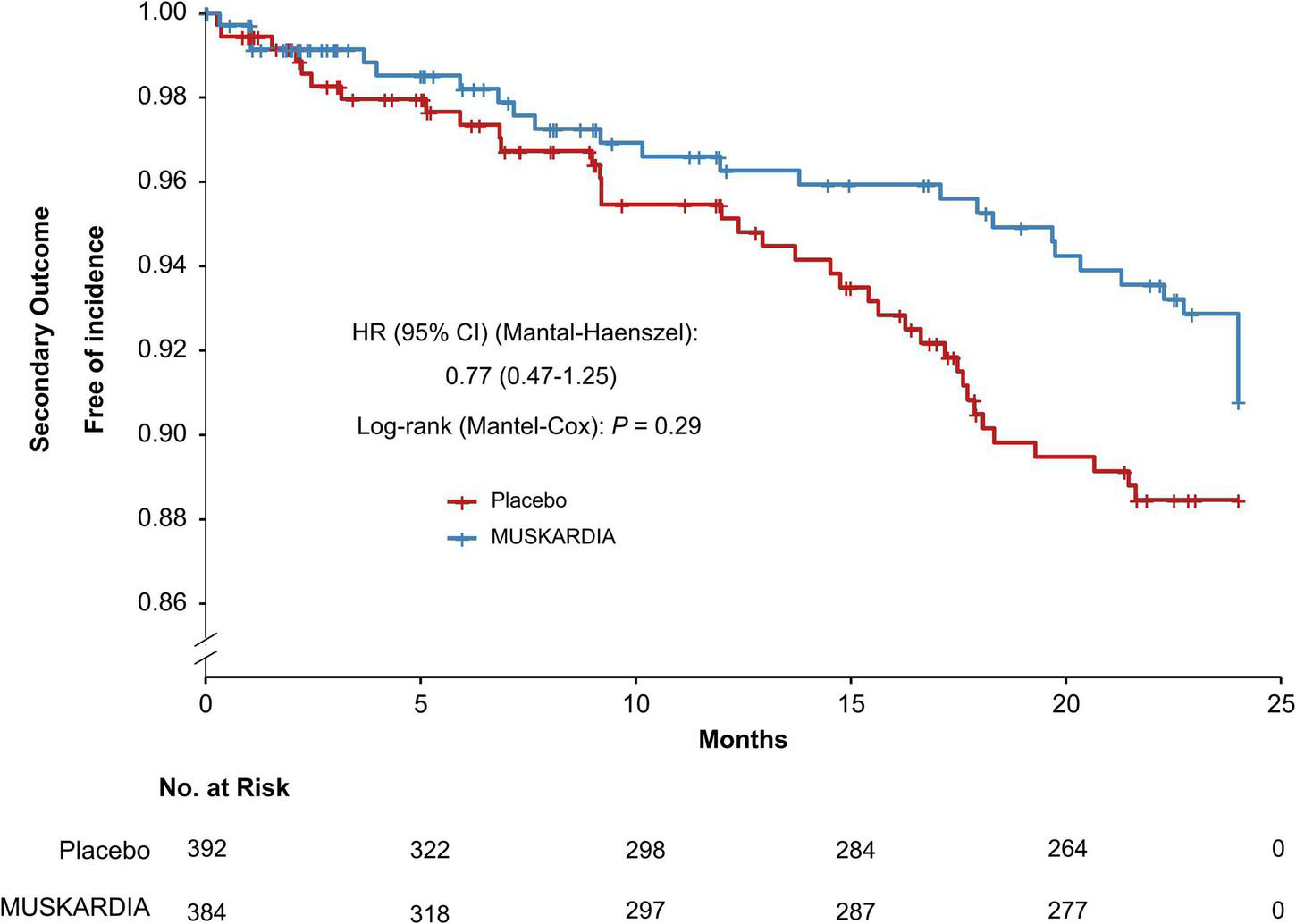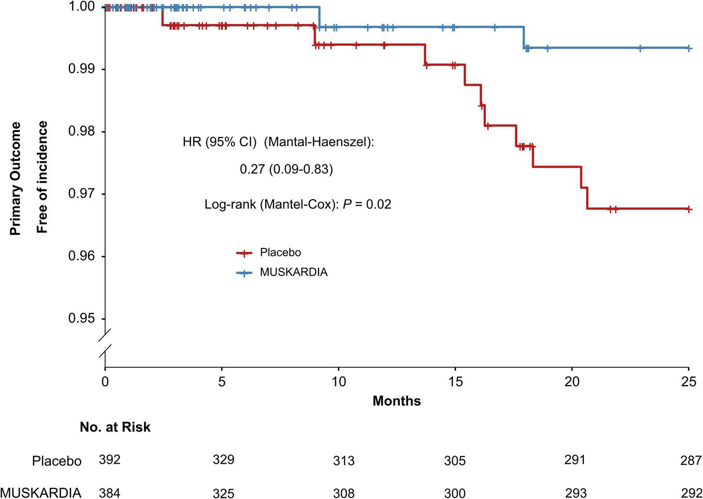 | Outcome | MUSKARDIA (n = 384) | Placebo (n = 392) | P |